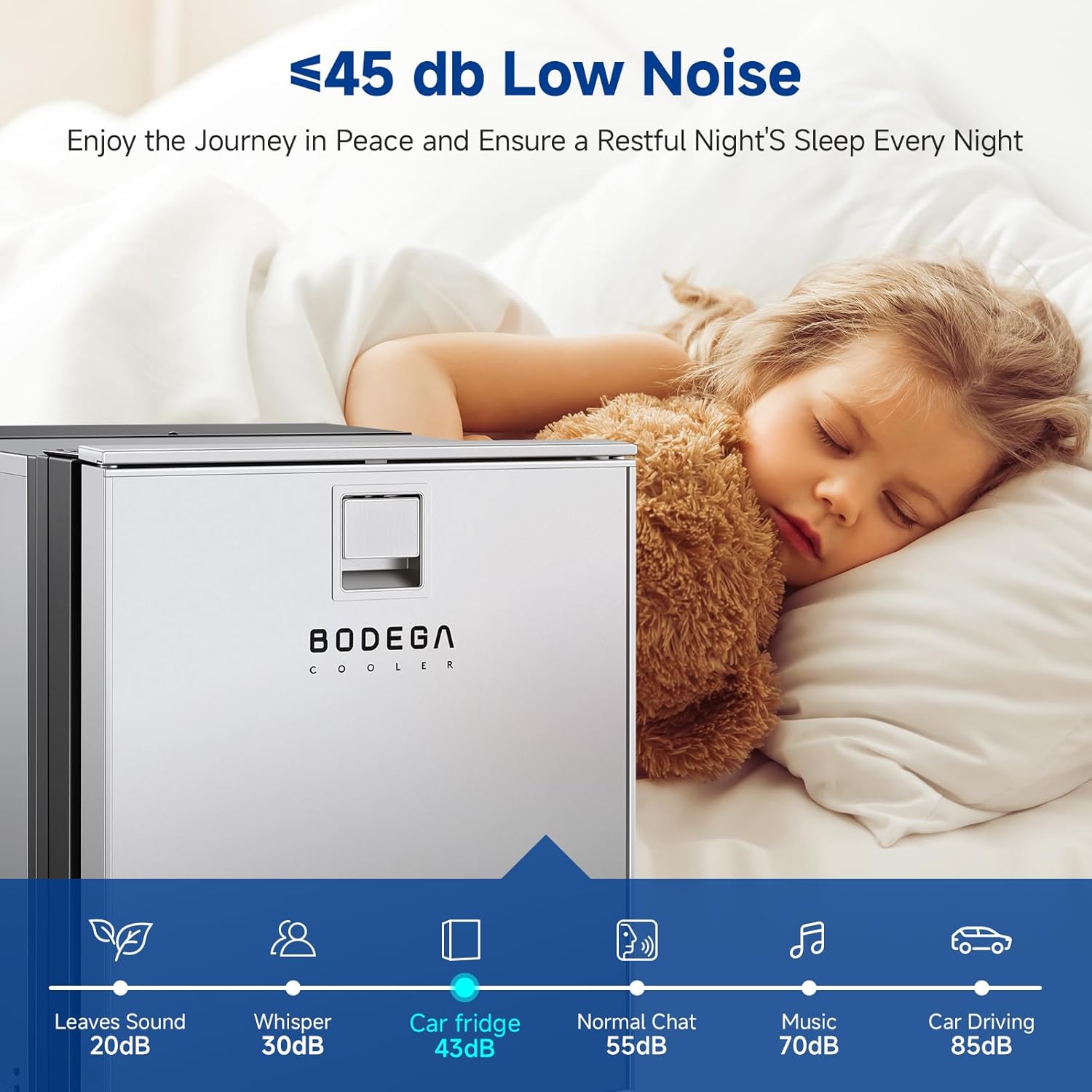 - Low Noise & Battery Protection: BODEGACOOLER Car Fridge provides 3 levels (H/M/L) of battery protection to prevent the car power supply from overloading or short-circuiting, so you don’t have to worry about running out of car power during your camping or journey. Less than 45dB low noise design provides a silent and comfortable environment for you when it is running. With anti-45°slip, our portable fridge can work normally even on bumpy roads