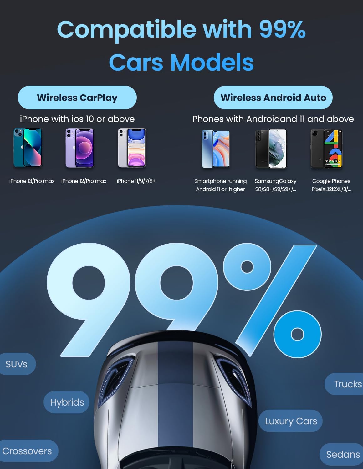 - đăCompatible Modelsă : Kello's carplay wireless dongle is Compatible with 2018-2024 cars featuring factory wired CarPlay, including Ford F-150, Chevy Silverado, RAM, Toyota, and Honda. Check our full compatibility list to ensure a perfect fit for your vehicle. This wireless carplay is available for iPhone 6 and up, iOS 10 and up, and Android 11 and up. Wireless carplay is made of special materials that dissipate heat and are safe and durable, so that you can drive easily and away from all the worries of using the product.