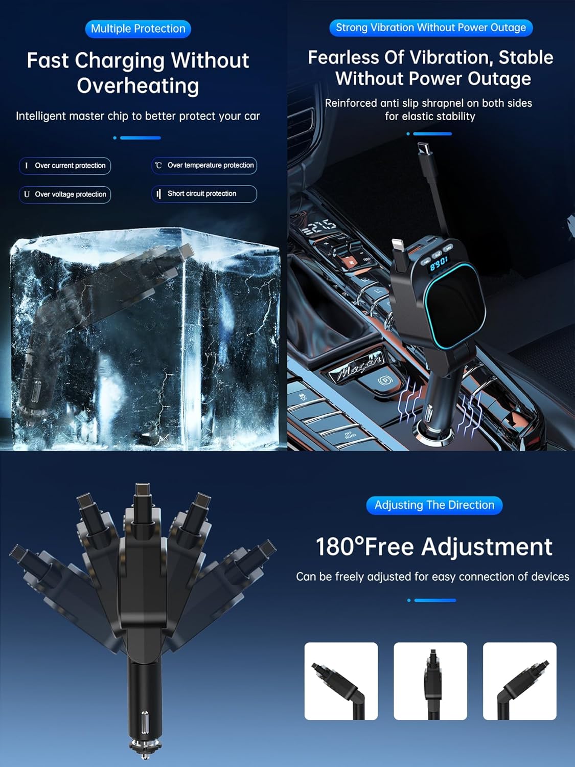 - Ⅰ: The Ultimate Multi Device Charging Car Organization : Car Charger USB C with Bluetooth Car Adapter- The 4 in 1 Retractable Car Charger with dual USB ports and versatile cable provides complete charging solutions. Perfect as truck accessories for men or gifts for drivers, this USB C Car Charger ensures fast charging for iPhone 16 Pro Max and Android devices. Keep your Car Charger-powered vehicle clutter free with smart organization.