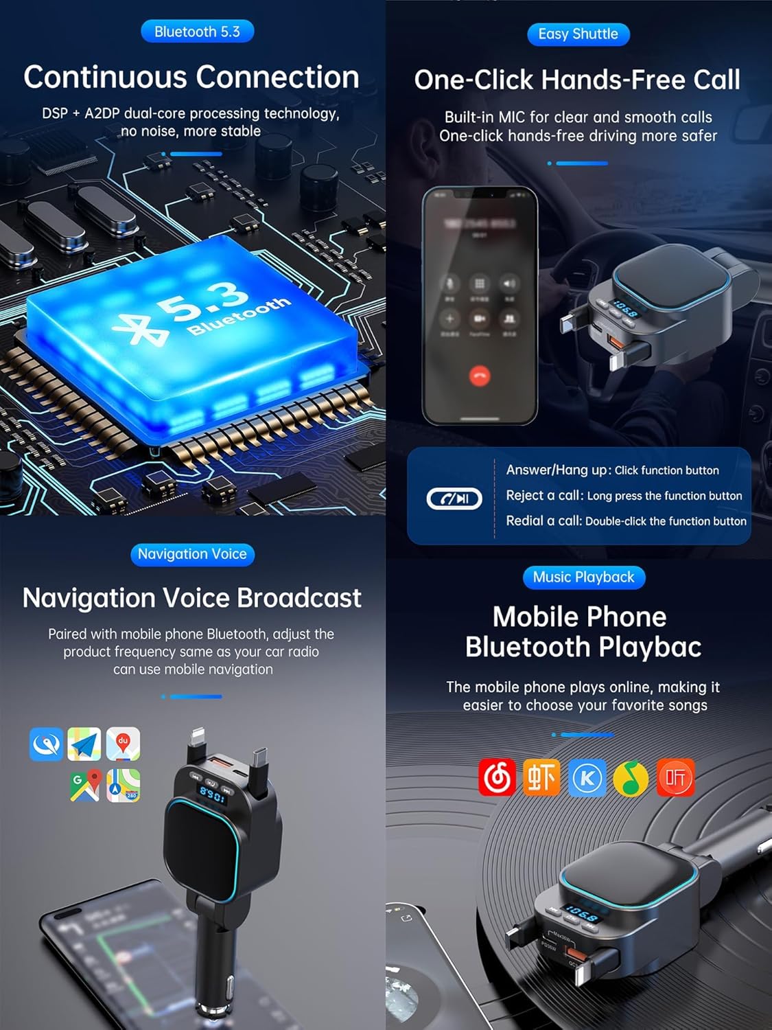 - Ⅲ: Upgraded Bluetooth 5.3 Technology: With the latest Bluetooth 5.3 technology, car adapter Bluetooth achieves faster pairing, lower latency transmission, and a more stable connection with less sound loss, offering you an uninterrupted calling and music playing experience. This Bluetooth 5.3 fm transmitter for car is designed to remember your last-connected device without the hassle of reconnecting the device everytime.