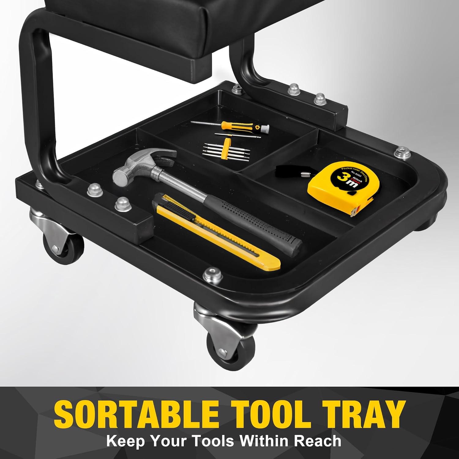 - 3 Compartment Tool Tray: The garage chair's bottom includes a 3-compartment tool storage tray to organize tools efficiently, serving as a wheeled shop stool or tool stool for quick access to bolts and screws during repairs.