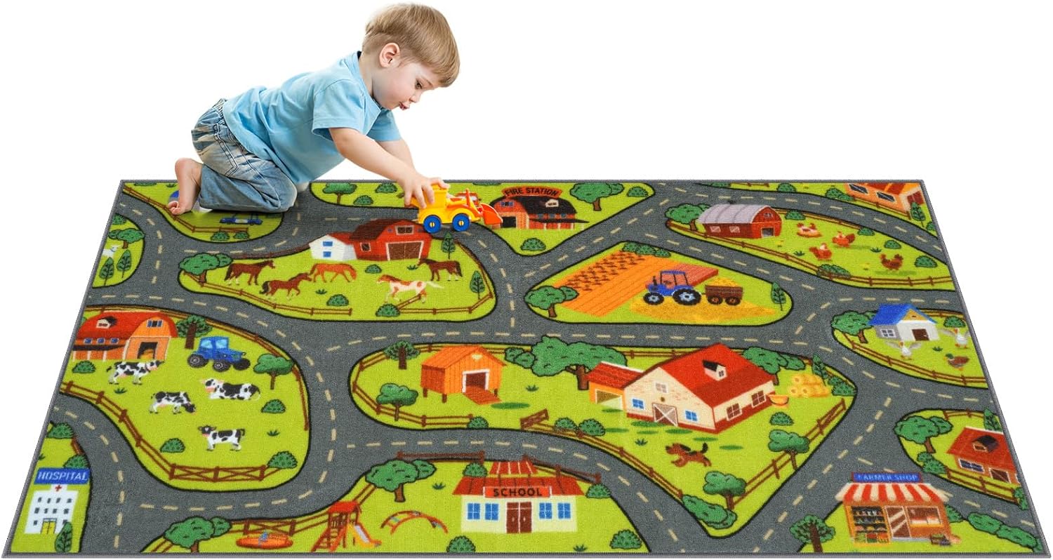 - More Surprises:Our car track rug, with a unique country farm life design, vibrant colors, and clear building road patterns, can promote children's vocabulary development, traffic knowledge learning, hand-eye coordination, motor skills, and cultivate children's spatial cognition and imagination. It is also an ideal choice for kids