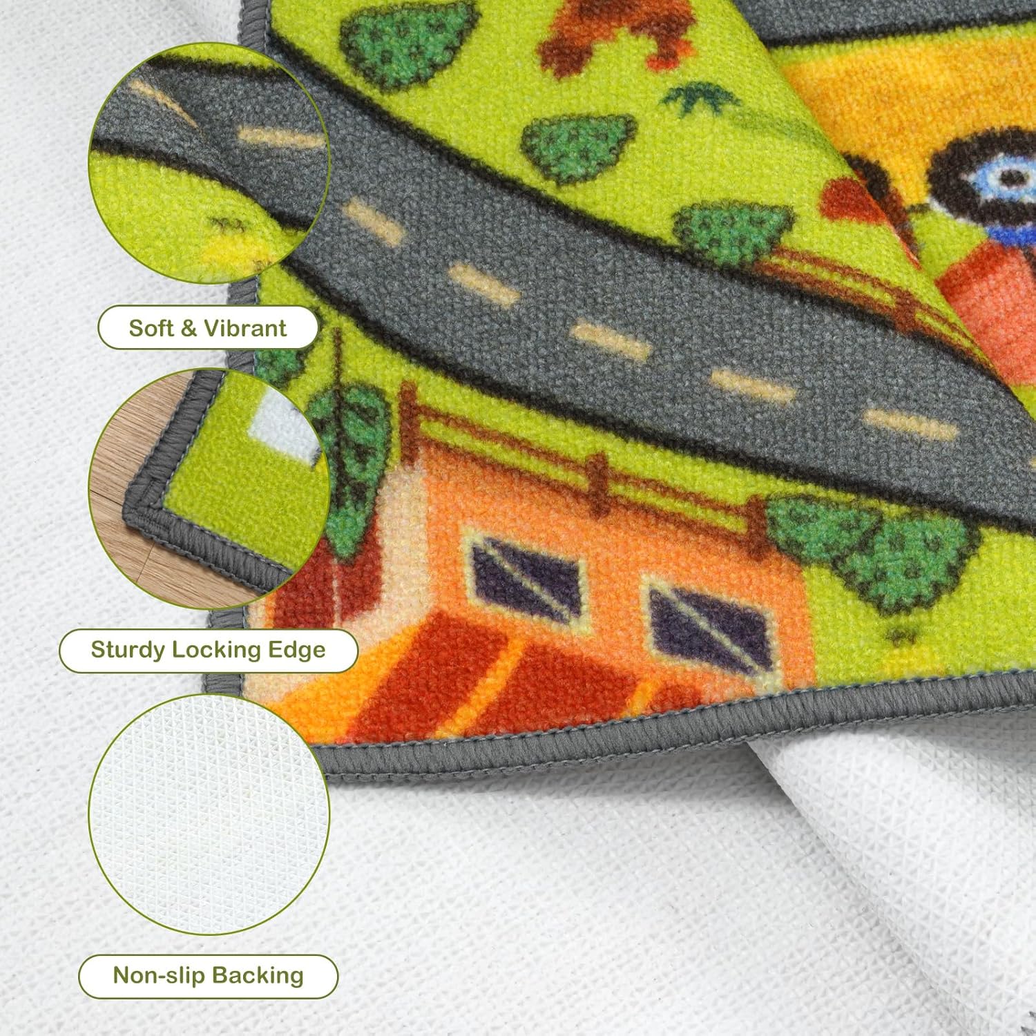 - Safe and Anti-Slip:The race car rug has a non-slip rubber back that enhances friction, ensuring the kids mat grips the floor well, preventing children from slipping and keeping the kids carpet in place during play
