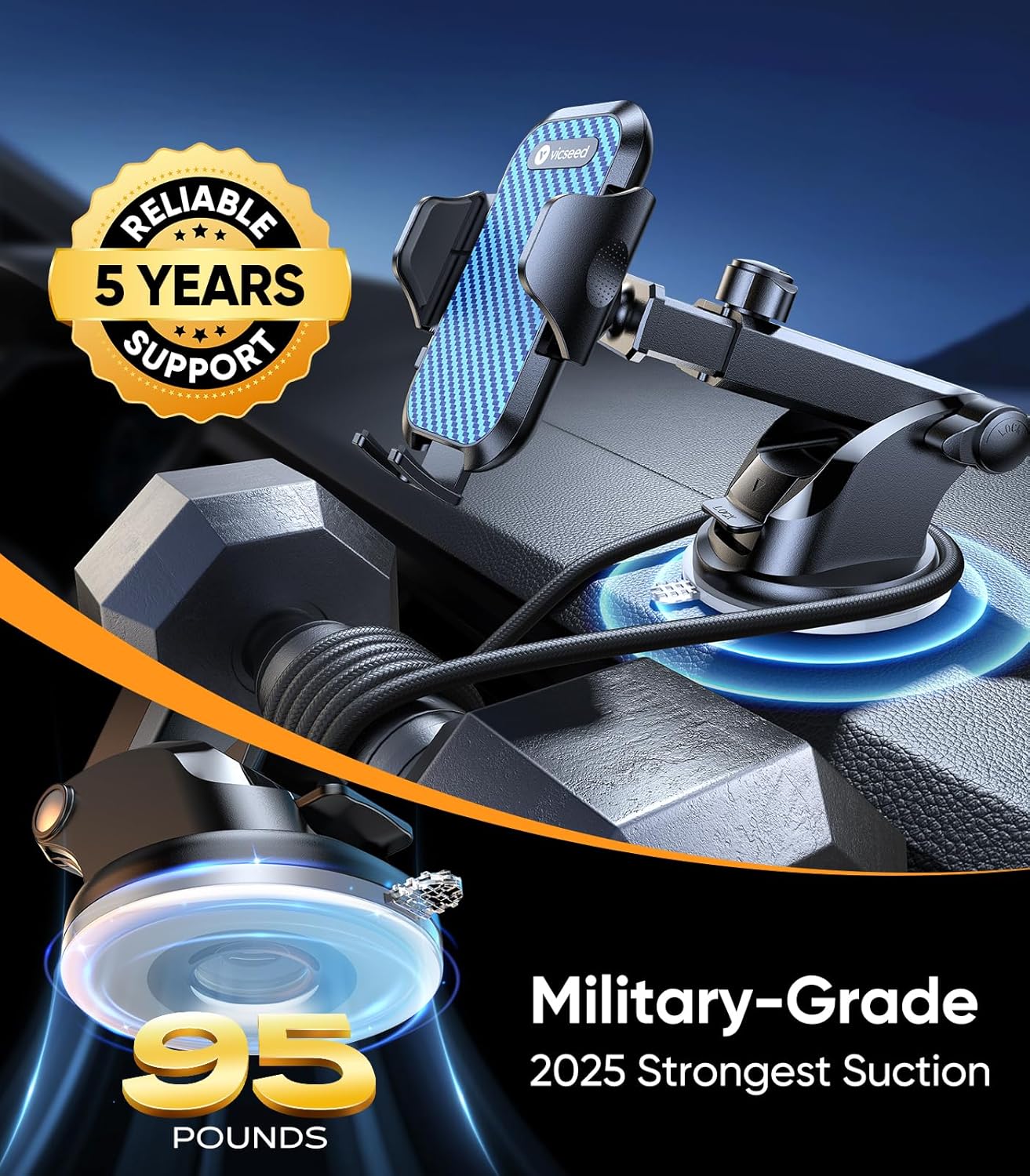 VICSEED Blue Phone Holders for Your Car [Upgraded True Military-Grade Strongest Suction] Cell Phone Mount for Car Dashboard Windshield Vent Truck Boat Stand Adjustable for iPhone Android Smartphones