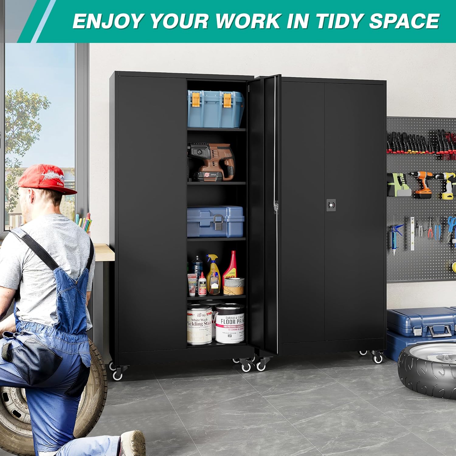- 【5 Tiers for Large Capacity】: Lockable garage cabinets storage uses 4 adjustable shelves. You can move to the desired height by adjusting the shelf according to the size of the things. so that you can divide the tool cabinet space distribution. You can also design garage storage flexibly and remove the shelves for more standing room.