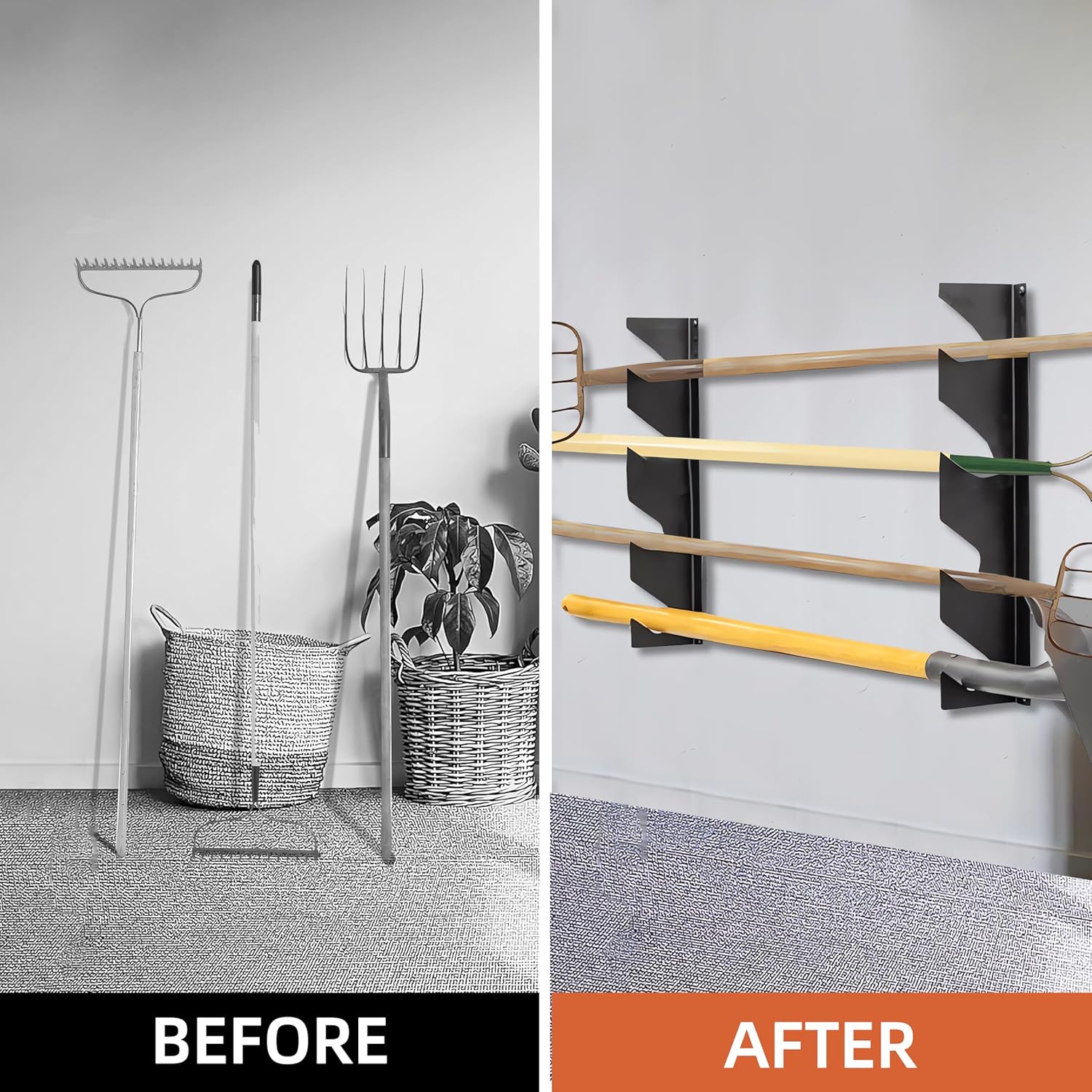 - Maximize Space with the Garage Tool Organizer Wall Mount:Transform your cluttered garage or shed into an organized space with this Garden Tool Organizer. Measuring 17.5" L x 4" W x 1" H, it securely holds shovels, rakes, brooms, and other long-handled tools, keeping them off the ground and easily accessible. Perfect for garages, workshops, and utility rooms