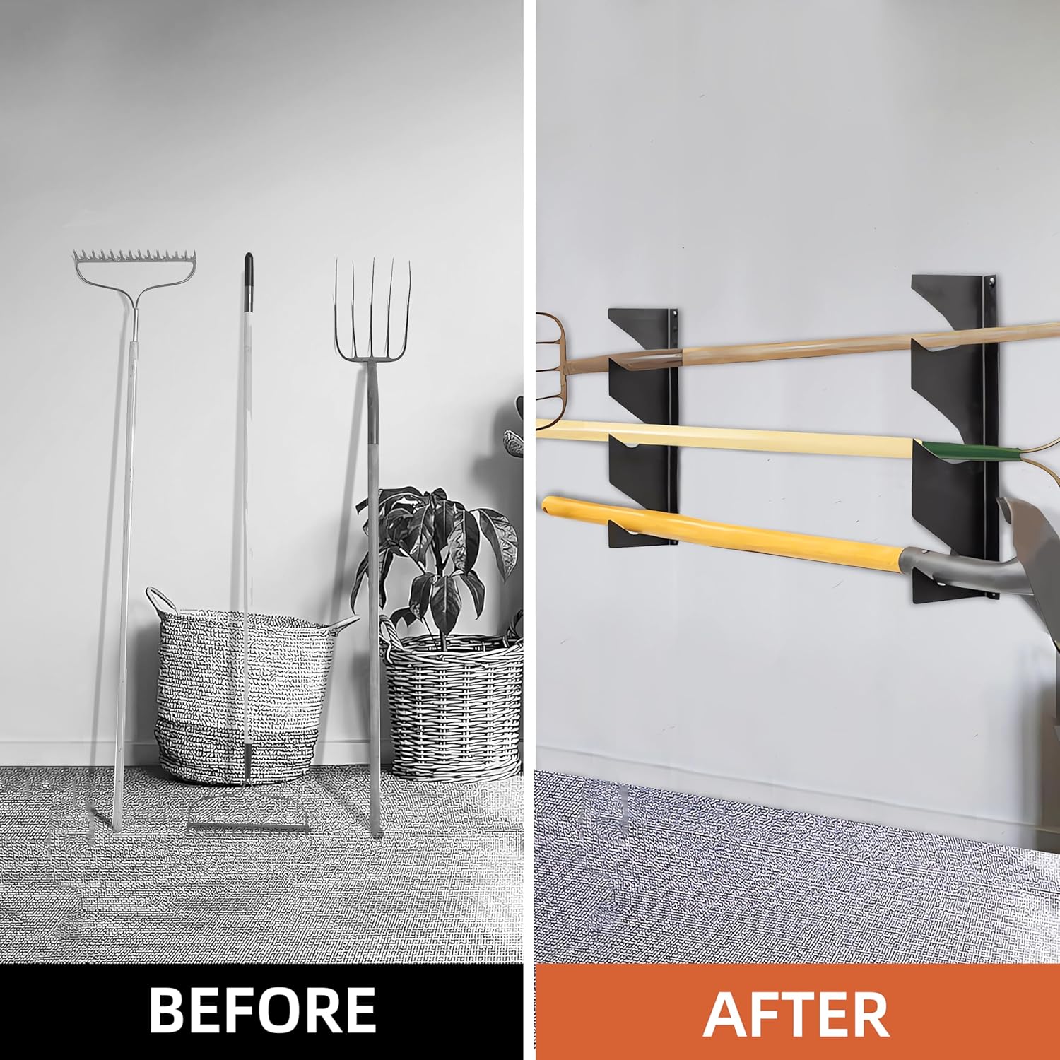 - Maximize Space with the Garage Tool Organizer Wall Mount:Transform your cluttered garage or shed into an organized space with this Garden Tool Organizer. Measuring 17.5" L x 4" W x 1" H, it securely holds shovels, rakes, brooms, and other long-handled tools, keeping them off the ground and easily accessible. Perfect for garages, workshops, and utility rooms