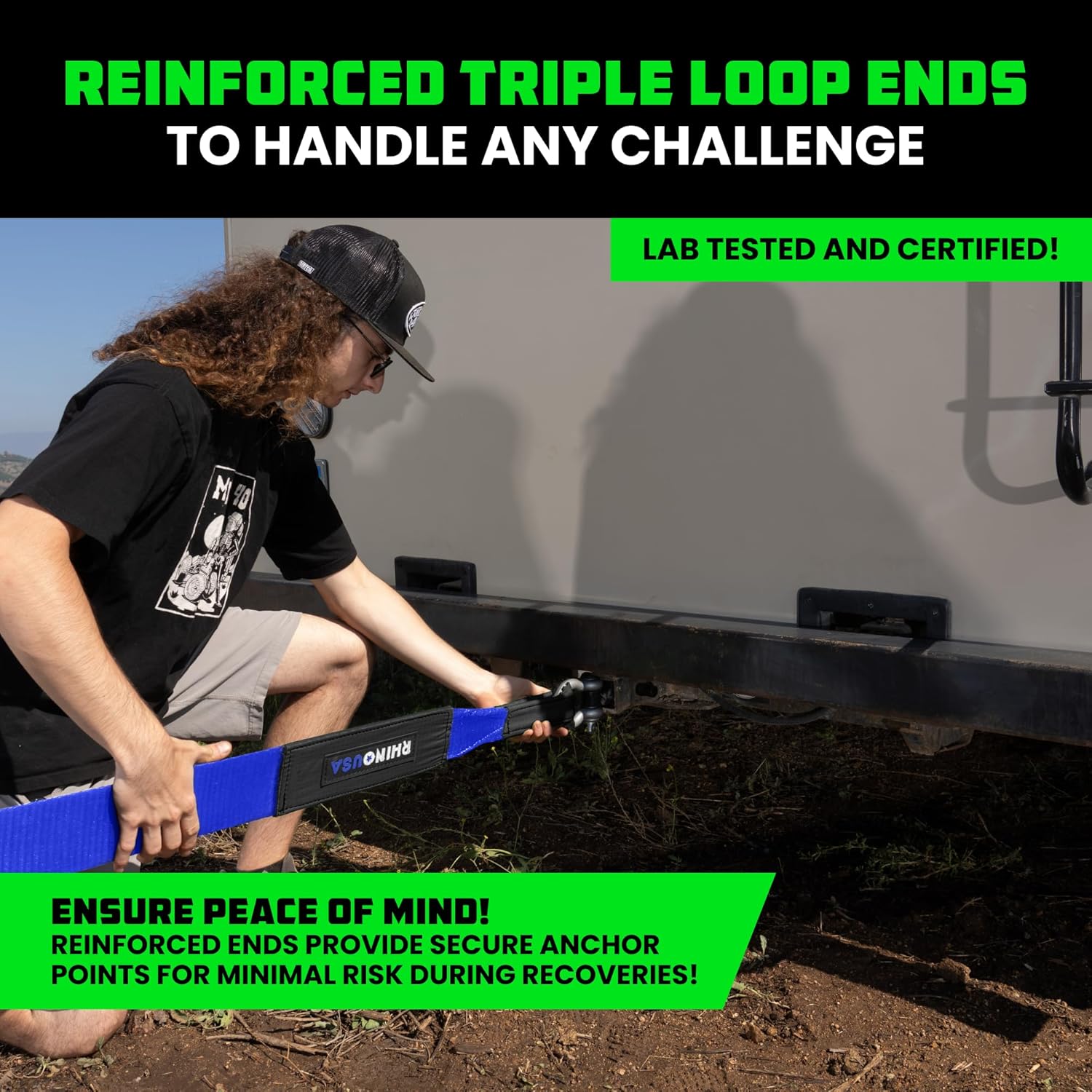 Rhino USA Recovery Tow Strap (4" x 30') - 40,320lb Break Strength - Emergency Recovery Strap Tow Rope for Diesel Trucks, Backhoe, Excavators & More - Heavy Duty Towing Strap for Offroad 4x4 Use (Blue)