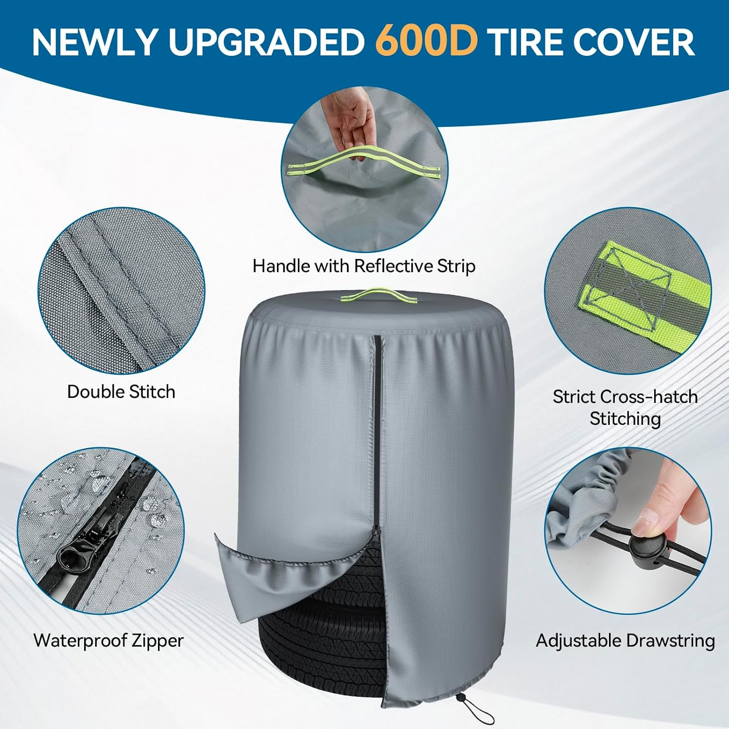 - ๐๐ฉ๐ ๐ซ๐๐๐๐ ๐๐๐๐ ๐๐๐ญ๐๐ซ๐ข๐๐ฅ&๐๐ญ๐ซ๐จ๐ง๐ ๐๐ซ ๐๐๐๐ญ๐ก๐๐ซ ๐๐ซ๐จ๐ญ๐๐๐ญ๐ข๐จ๐ง: Surface Waterproof Coating+PA Backing, and all seams are sewed with double-stitched seams, keep the seams of the tire cover away from water seepage and breakage. The sturdy 600D fabric also protect your spare tire outdoor storage from sun, snow, rain, frost ust,dust, scratchs,rips, fallen leaves and bird droppings .Double stitching mixed with Upgraded Anti-UV Composite prevents the cover from ageing, disintegration and tearing caused by exposure to the sun.
