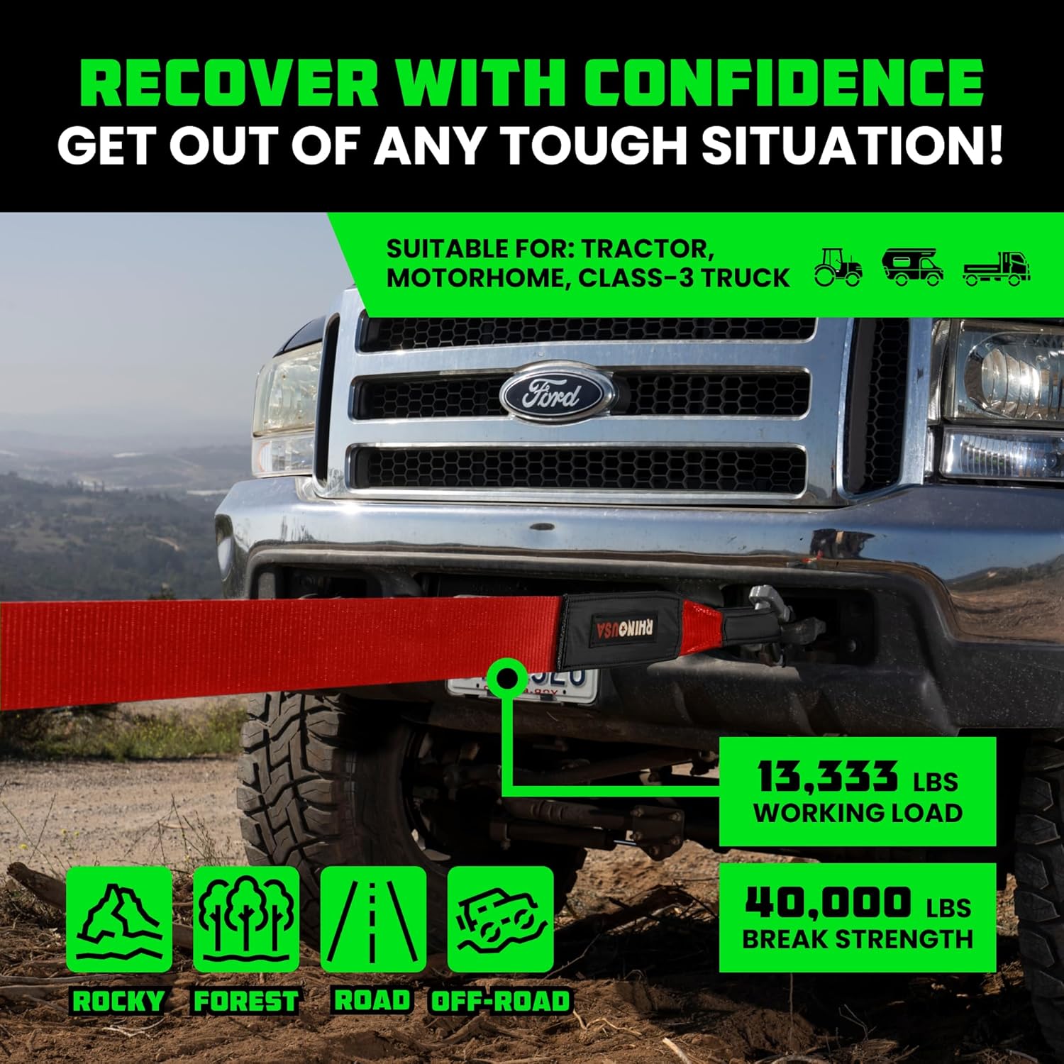 Rhino USA Recovery Tow Strap (4" x 30') - 40,320lb Break Strength - Emergency Recovery Strap Tow Rope for Diesel Trucks, Backhoe, Excavators & More - Heavy Duty Towing Strap for Offroad 4x4 Use (Red)