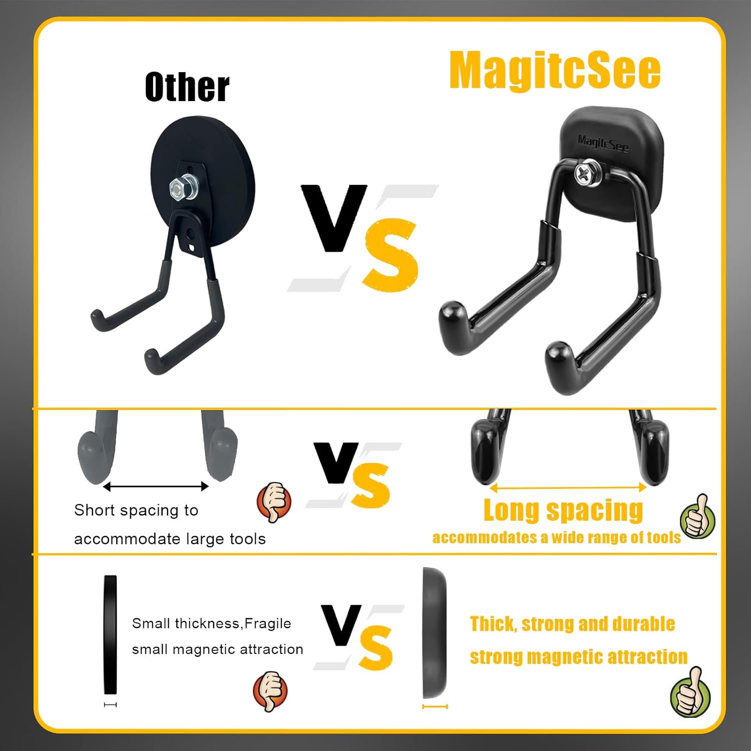 - Versalite Applications: Great for hanging items like power drills, shovels, hoses, cords, ropes, coats,gym bags, and mops on walls. Ideal for garages, vehicles, warehouses, workshops, offices, and outdoor activities like camping or DIY projects.