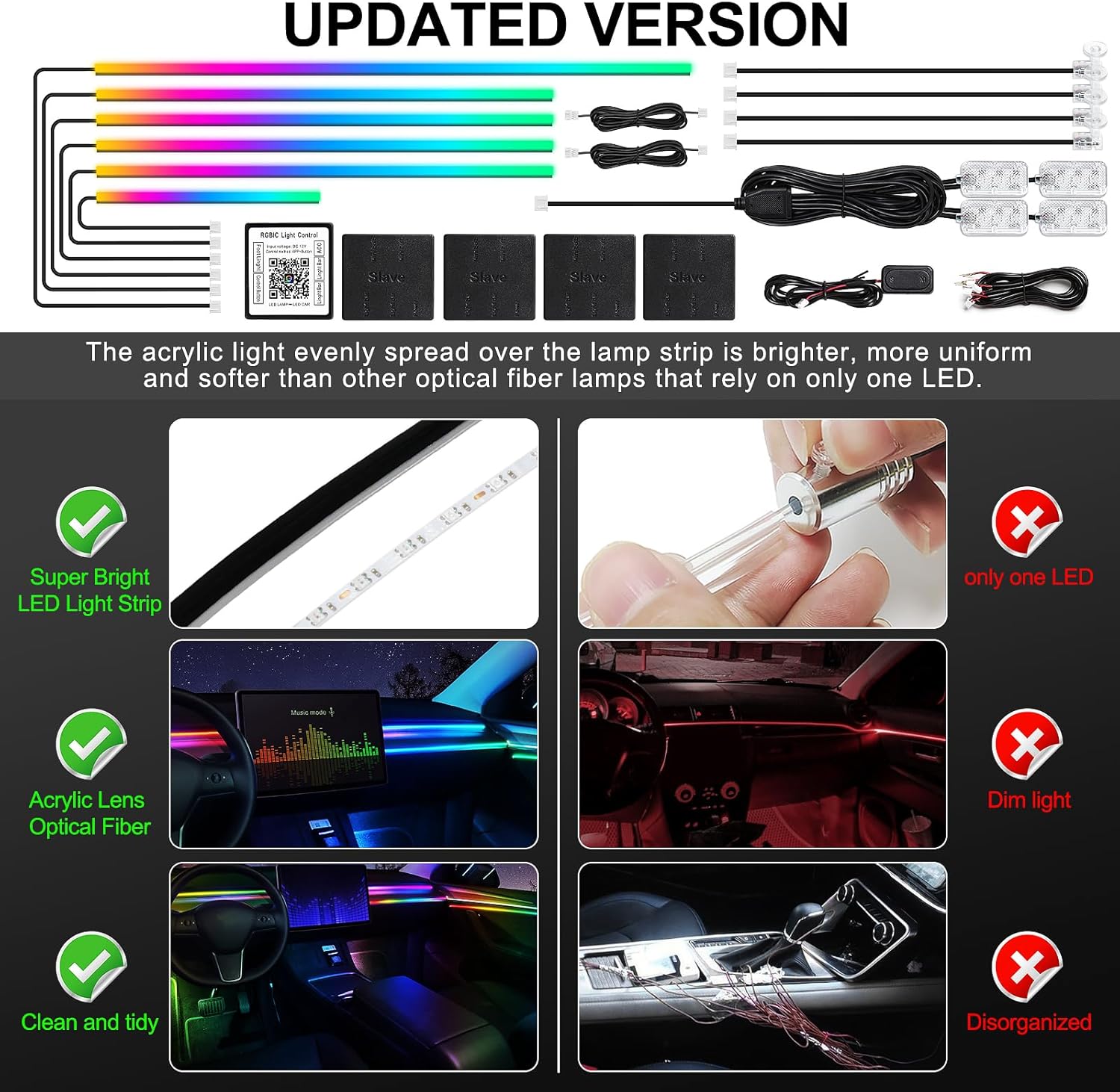 - ăHigh Bright & UniformăThe Dream+color Acrylic LED Car Ambient Interior Lighting have super bright LED and acrylic lens and contains 6 LED strips (4*29.5inch+1*43.3inch+1*14inch), Foot well lamp*4(44.5inch*2/64.9inch*2) and Door handle light*4(21.6inch), also comes with 1 main controller and 4 sub controllers,and can be flexibly installed on any car by DIY without disorganized, which is plug and play, and this acrylic light evenly spread over the lamp strip is brighter, more uniform and softer than other optical fiber lamps that rely on only one LED.