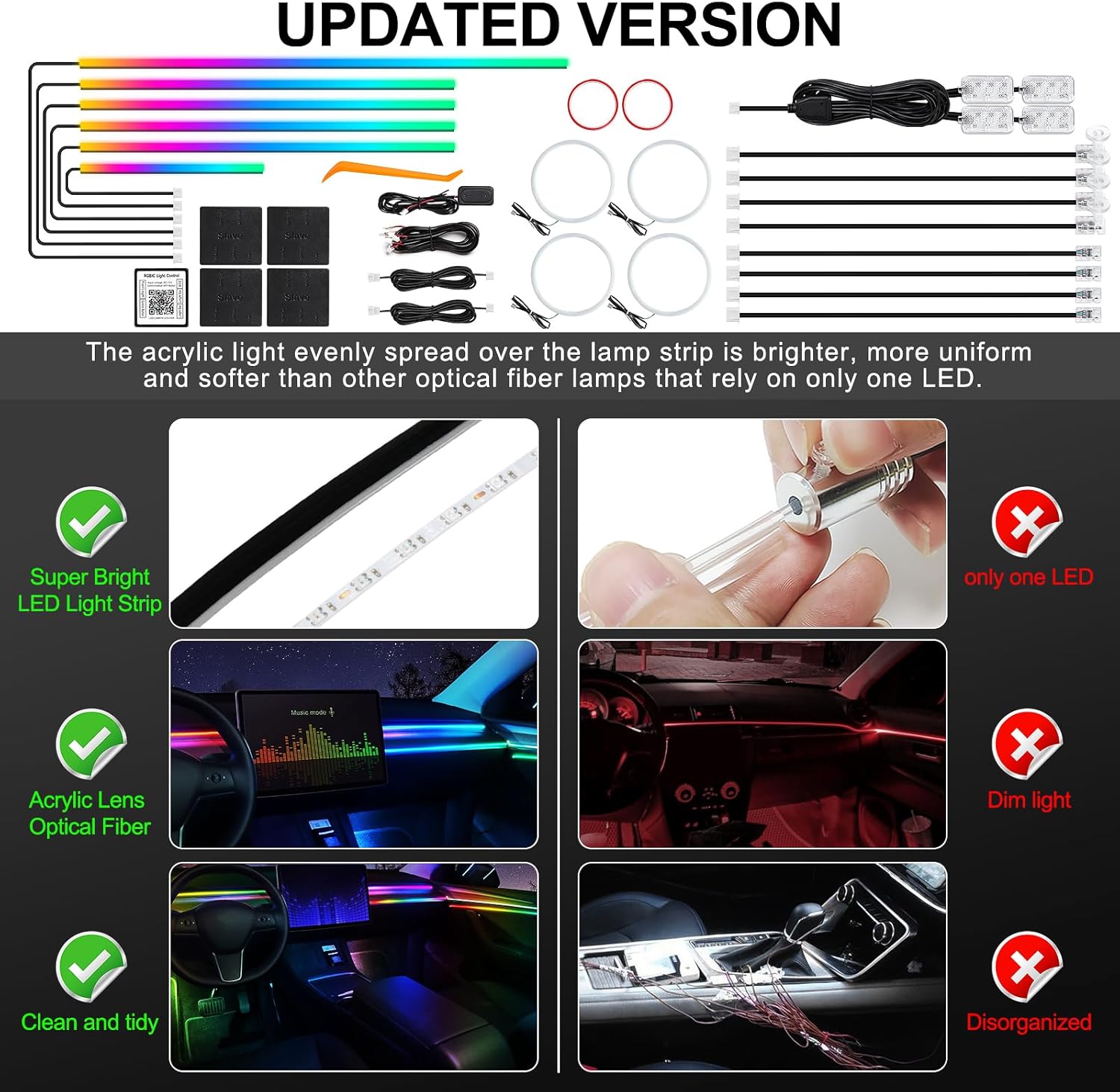 - ăHigh Bright & UniformăThe Dream+color Acrylic LED Car Ambient Interior Lighting have super bright LED and acrylic lens and contains 6 LED strips (4*29.5inch+1*43.3inch+1*14inch), Foot well lamp*4(44.5inch*2/64.9inch*2) and Door handle light*4+doors storage box light*4 (21.6+21.6inch)+Door horn light*4(5.9inch+ line 19inch*1),also comes with 1 main controller and 4 sub controllers,and can be flexibly installed on any car by DIY without disorganized, which is plug and play, and this acrylic light evenly spread over the lamp strip is brighter, more uniform and softer than other optical fiber lamps that rely on only one LED.