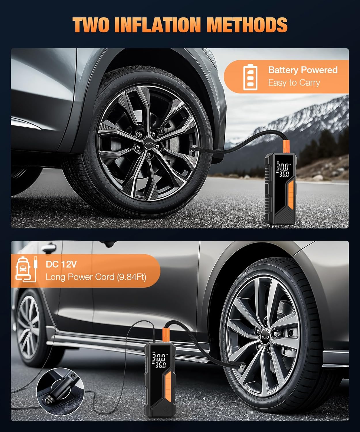 - LCD Dual Screen: The air inflator tire pump can clearly display the real-time pressure value and the preset pressure value. The measurement accuracy is Β±0.5PSI, which allows you to easily monitor the tire pressure and automatically shut down when the preset value is reached, making inflation safer.