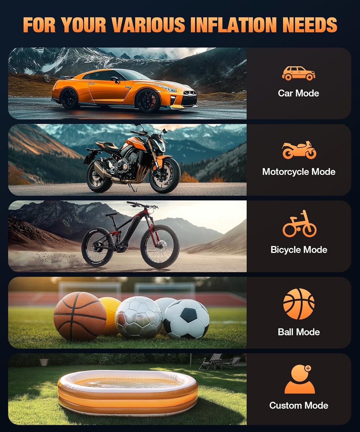 - 5 Inflation Modes: The cordless air compressor has four preset inflation modes suitable for bicycles, motorcycles, cars and balls. The fifth custom mode can also set the pressure value according to the inflated object to meet various inflation needs.