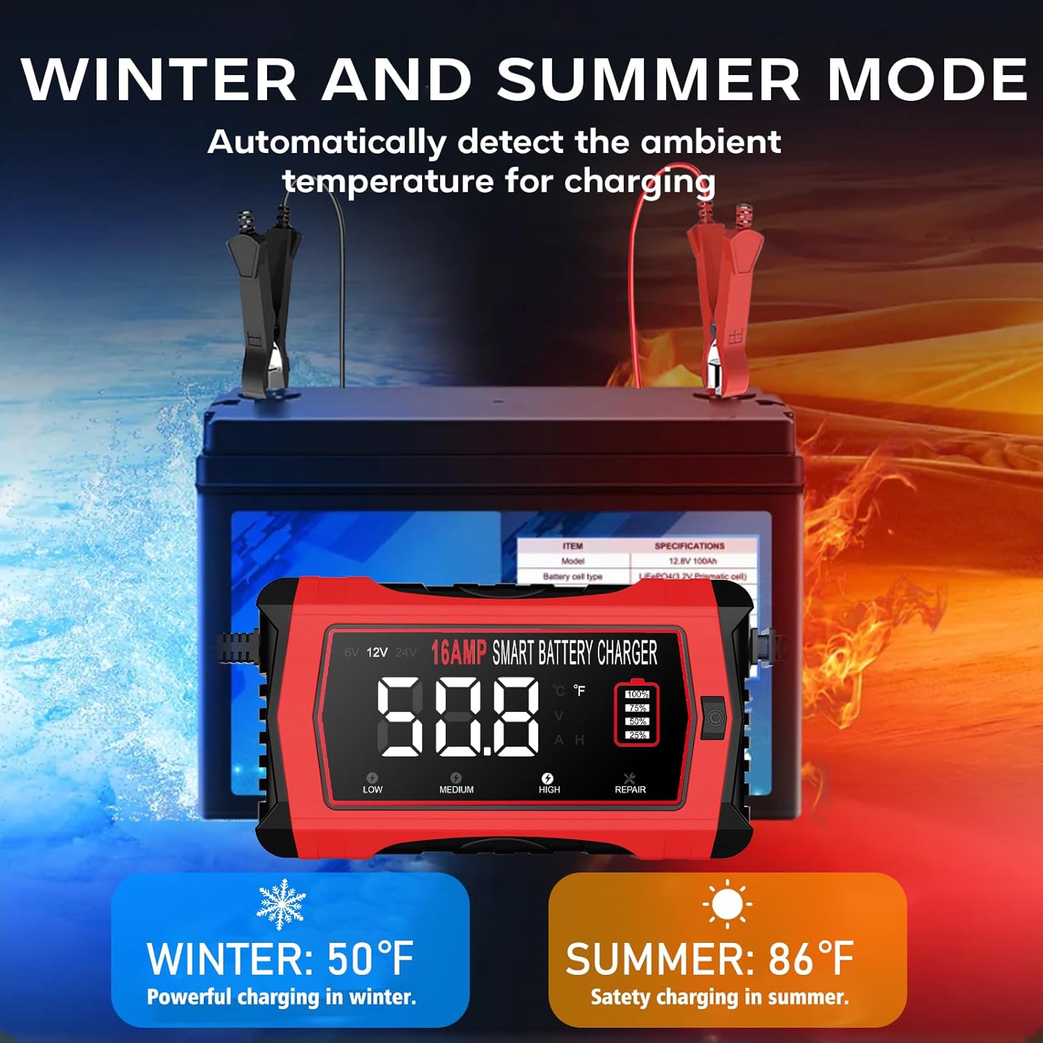 16-Amp Battery Charger, 6V/12V/24V Smart Car Battery Charger, Automotive Battery Maintainer, Trickle Charger for Car, SUV, Motorcycle, Boat, Lead-Acid, Lithium, LiFePo4 Battery