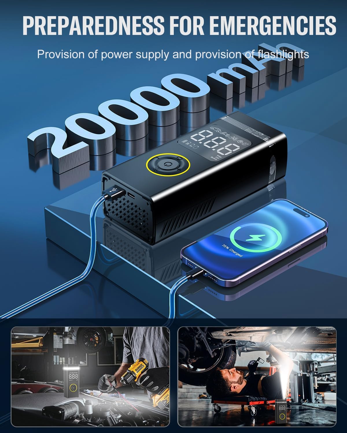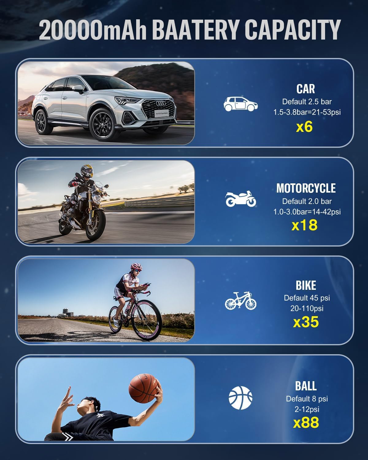 Tire Inflator Portable Air Compressor,200PSI 20000mAh Pump for Car Cordless with Pressure Gauge,5X Fast Inflation with Dual Lights for Cars Bicycles Motorcycles Balls