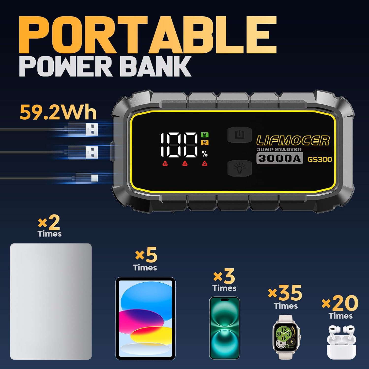 - ăLIFMOCER 3000A Jump Starter With LCD DsiplayăWhen you have dead batteries on a road trip, you don't have to guess by the indicators anxiously or wait hours for AAA/someone for help on desolated interstates. With a powerful 59.2Wh battery, This jump pack can easily jump start (up to 10.0L gas or 8.0L diesel) 12v vehicles in 1-2 seconds.