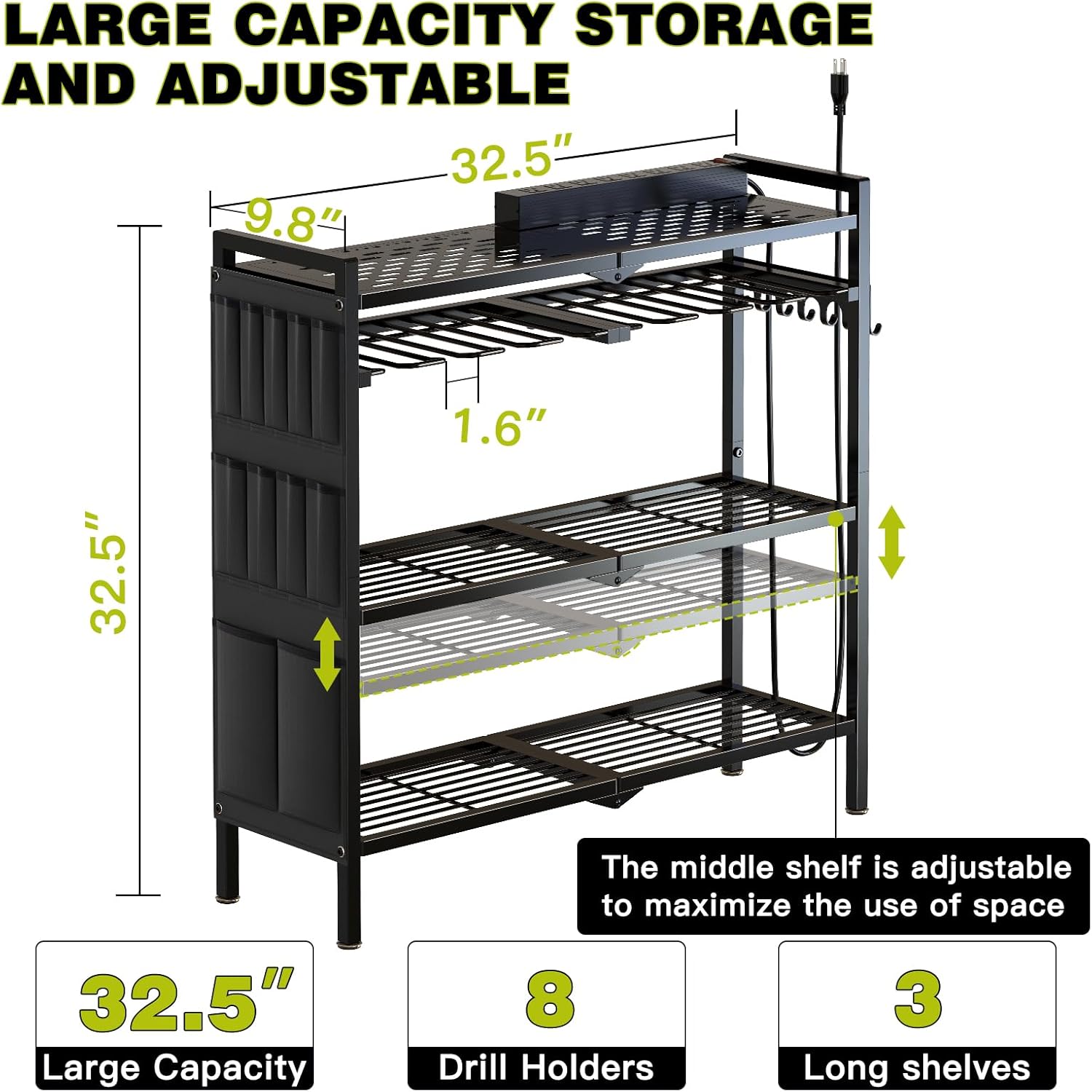 Large Power Tool Organizer Cart with Charging Station 8 Drill Holder Garage Storage Standing Heavy Duty and Stability Storage Rack Utility Tool Shelf (Black)
