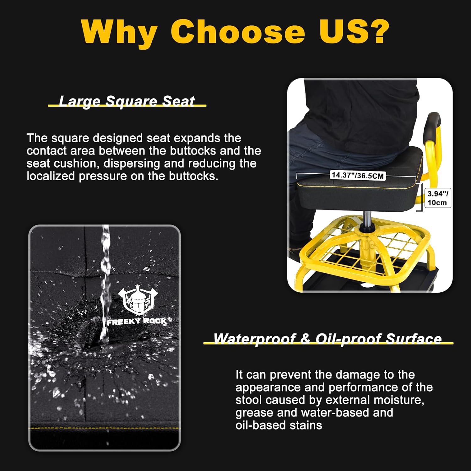 - ă330 LBS & 360°SwivelăThe heavy duty mechanic workbench stool 's maximum weight capacity of around 330 pounds. It is an ideal choice for garage,workshop, auto repair and other places. The flexible 360° rotating seat and casters ensures efficient and agile movement between work areas