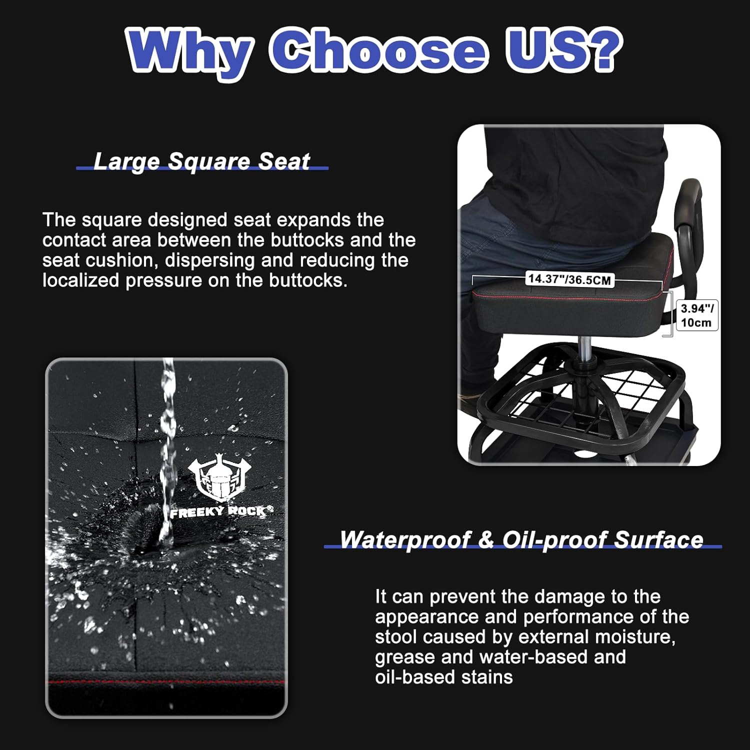 - ăThickened Seat Cushionă14.37"/36.5CM Diameter Seat. 3.94"/10 CM height cushion. The thickened memory foam padded cushion seat is larger than other garage work stools. The cushion surface of stool is made of PVC material which is waterproof and oilproof, making it easy to be cleaned