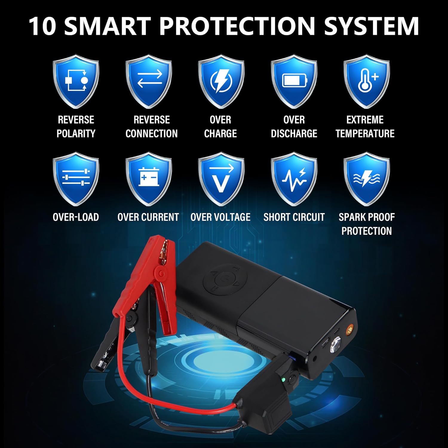 - ✅ 【10-Layer Safety Protection】The jump starter includes several safety features, provide with a unique honeycomb design that enhances heat dissipation, improving safety performance by 30% and extending service life by 50%. Not only that, it works with intelligent jumper clamps which provide 10 built-in safety protections: reverse connection, reverse polarity, over-charge, over-discharge, extre temperature, over-load, low-voltage, short circuit, spark proof protection.