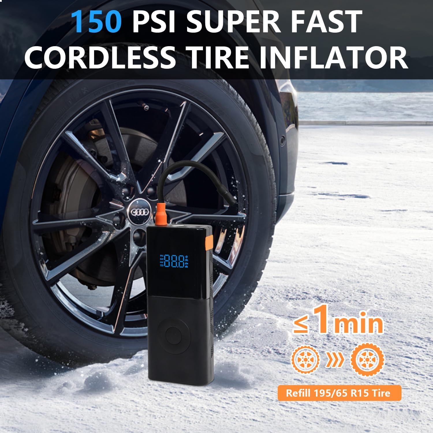 - 🔌【All-in-One Power Station】Portable jump starter with air compressor combines 4-IN-1 functions: car emergency start, tire inflation, power bank, and flashlight.It supports 4 optional units (PSI, BAR, KG/CM²) and 5 adjustment modes (Cars, Motorcycles, Bicycles, Basketball, Pressure Protection). With unique turbocharged capability of 35L/Min (150 PSI), it can quickly inflate a car tire to 20 PSI in just 2 minutes, and also will automatically stop when fully inflated.