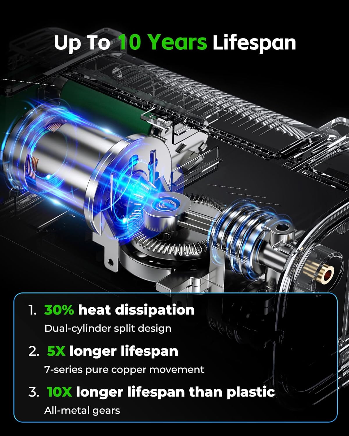 - 【Long-lasting Durability for Years of Use】 - Trust in the durability of our portable air compressor for car tires. Engineered with a dual-cylinder split design for 30% enhanced heat dissipation, it ensures extended lifespan. Featuring a 7-series pure copper movement, it boasts 5 times longer lifespan than competitors. Plus, all-metal gears provide 10 times longer lifespan compared to plastic gears, ensuring reliable performance for years to come