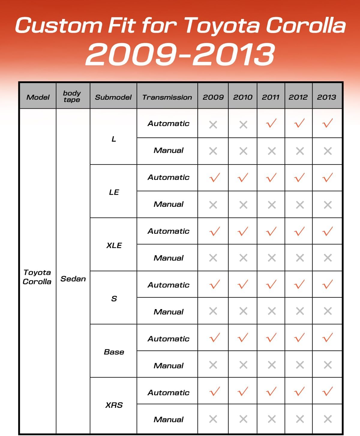 - All-Weather Protection: These durable floor liners for Corolla 2009 2010 2011 2012 2013 shield your vehicle's interior from snow, mud, sand, and seawater. Built to last, they keep your sedan for Corolla clean and protected year-round, even in extreme weather