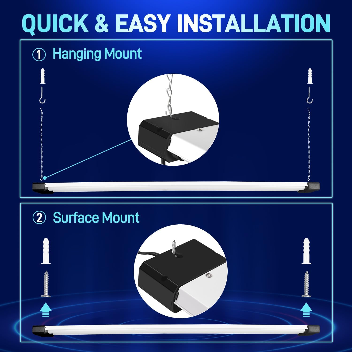 - β Easy Installation - Plug & Play. Come with 59" power cord with on/off switch and other small accessories. You can hanging it with the included hanging chains or directly mounted to the ceiling with the included mounting screws.