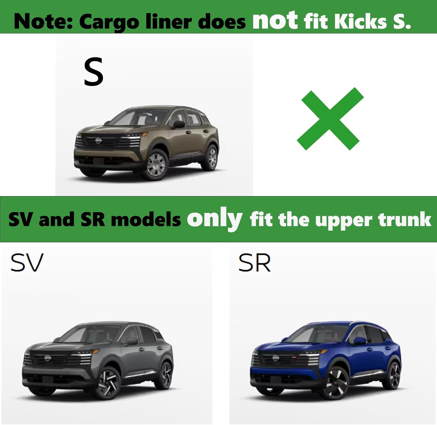 - Custom Fit: Floor mats fit for Nissan Kicks 2025 2026(Cargo liner is not compatible with Kicks S). Includes 2 front floor mats & 1 rear floor mat & 1 cargo liner. If creases are caused by transportation, please put the mats in the sun for a while or blow them with a hair dryeries