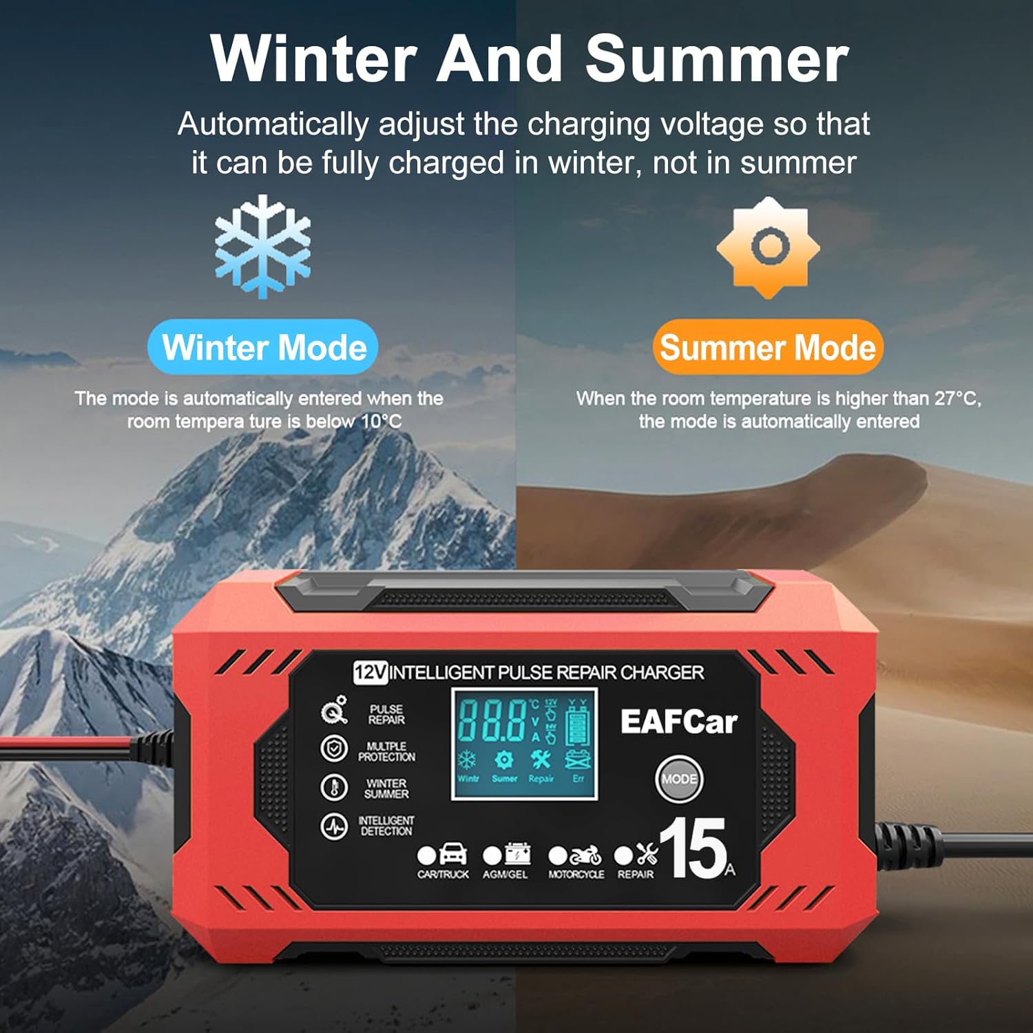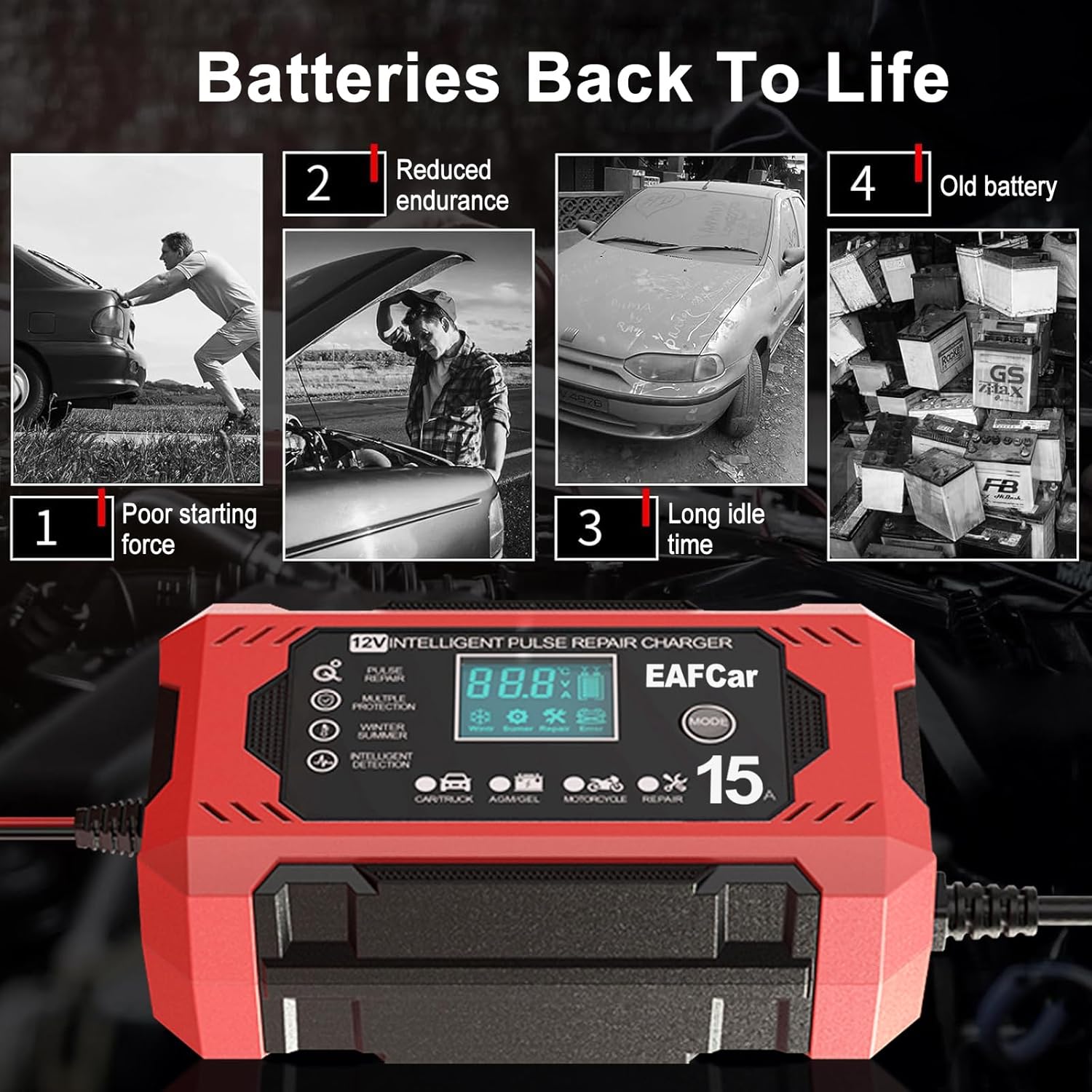 15-Amp Battery Charger, 12V Trickle Charger Car Battery Charger, Smart Automatic Lead Acid Charging with Temperature Compensation for Car Truck Lawn Mower Boat Marine(15A)