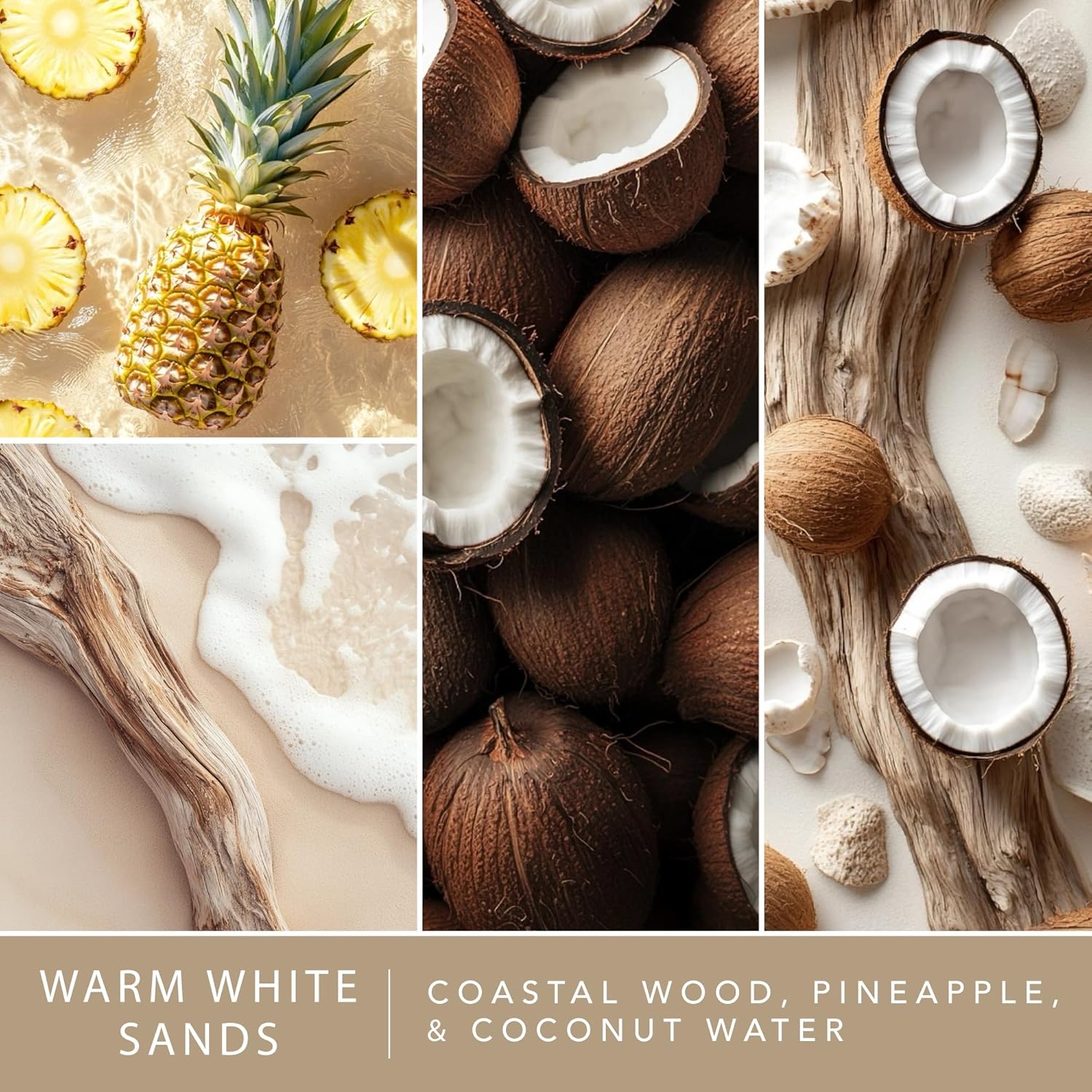 - PINEAPPLE, COASTAL WOOD, & COCONUT WATER - Sink into a sunlit daydream, kissed by juicy pineapple and coastal woods. Sun-warmed sands and refreshing coconut water complete this tranquil seaside escape.