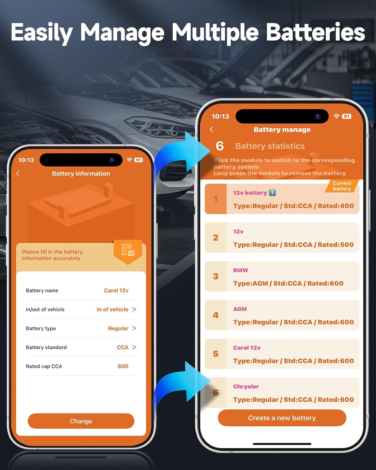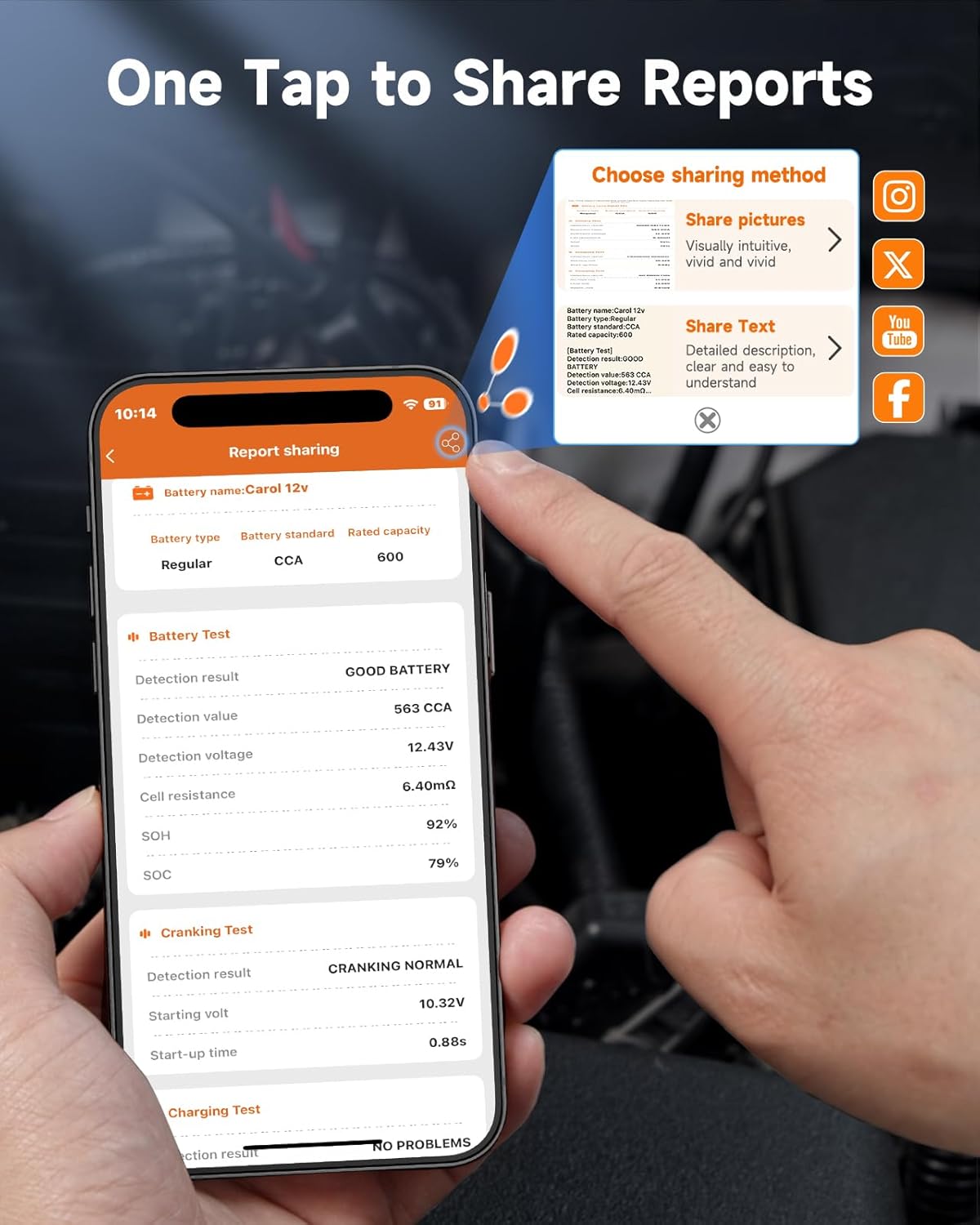 - Accurate Tracking Reliable Diagnostics â Assign custom names or tags to each battery for quick identification by vehicle, customer, or application. Track health and usage history over time for better maintenance decisions. Need to share test results? Instantly send detailed reports via text or image with a single tap on your phone or tabletâno printing, no paperwork. Ideal for shop techs, fleet managers, battery dealers, and DIYers alike, this compact FOXWELL battery tester keeps your workflow organized and efficient wherever the job takes you.