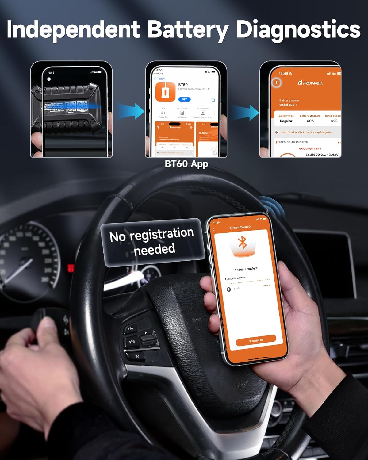- Pro-Level Features Without the Pro Price - Why pay hundreds for features that now fit in your pocket? Backed by 14+ years of FOXWELL expertise, the BT60 12v battery tester delivers the advanced functions youâd expect from high-end testersâfull app control, wireless Bluetooth connection, unlimited battery ID tagging, instant result sharing, and Quick Start Guide in-app support. Whether you're a pro tech or a hands-on DIYer, this tool gives you premium power without the premium price.