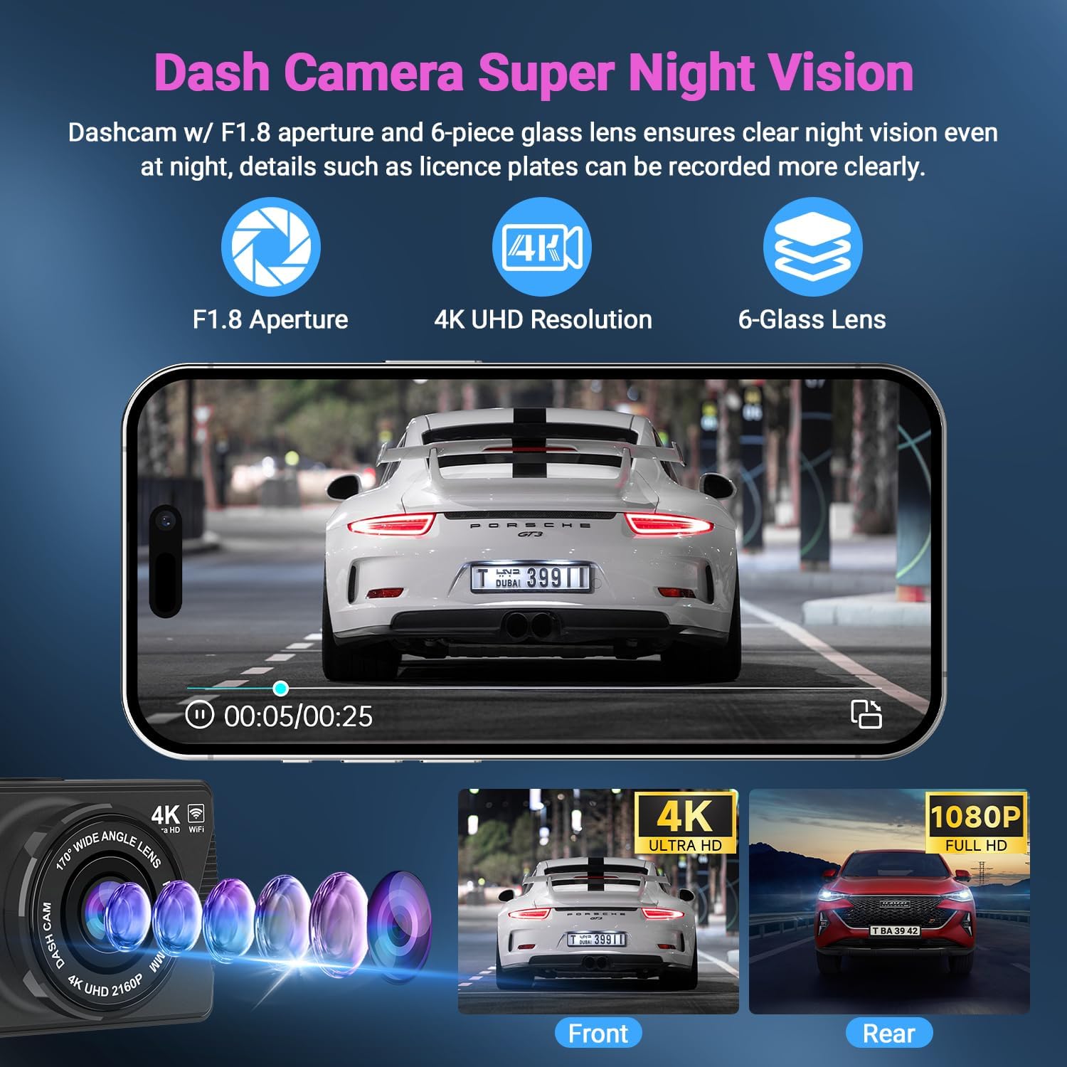 - Special Feature : Built-In Microphone dash cam front and rear, App Contorl dash cam; Built-In Display dash camera for cars, Built-In Speaker dashcam front and rear camera; Built-In WiFi dash camera; Compact Design dashcam, Dash Cam USB powered; 4K car dash cam; 3 inches car cameras dash cam; car dash camera front and rear with two suction cups, G-Sensor car camera - dash cam front and rear; Internal Memory car camera; Loop Recording dashcams for cars, Night Vision camera for car; Parking Monitor front and rear dash camera; Reverse Assist car dash cam front and back Built-In Microphone dash cam front and rear, App Contorl dash cam; Built-In Display dash camera for cars, Built-In Speaker dashcam front and rear camera; Built-In WiFi das… See more
