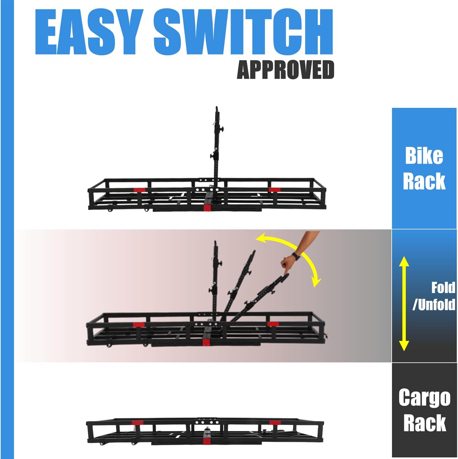 - 2-IN-1 CARRIER, HOLDS UP TO 300LBS: Enjoy your outdoor trips with our versatile hitch cargo carrier and bike rack combo. The product easily switches between cargo carrier and bike rack modes. Fold it down for a spacious cargo carrier or unfold for a ebike rack that securely holds 2 heavy-duty bikes. Designed for vehicles with a 2-inch receiver, it's sturdy and fits cars, Trailers, SUVs, trucks, RVs and miniVANs