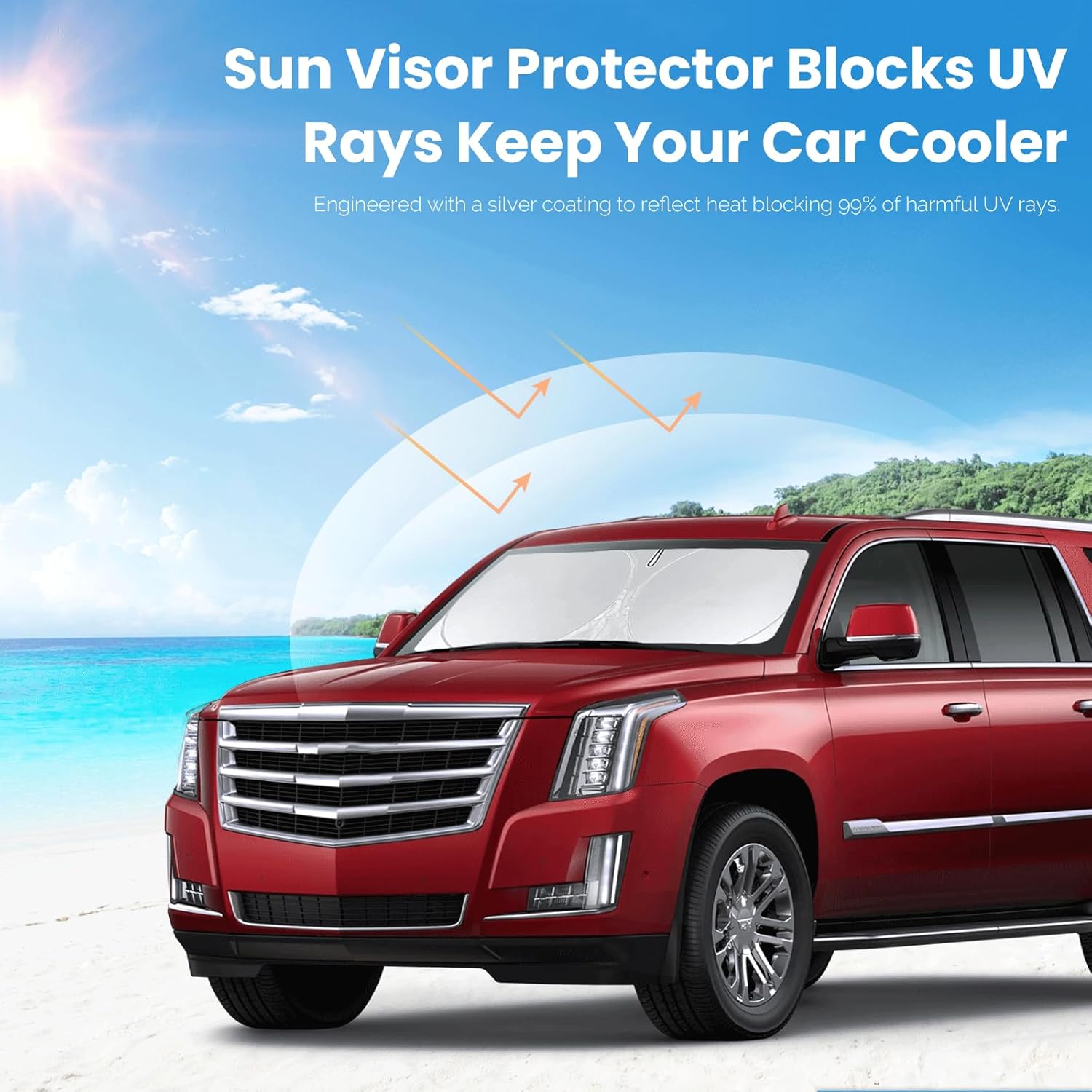 - [CUSTOM-FIT FRONT WINDSHIELD SUNSHADE] Automotive windshield sun shade is Specifically designed,which for Cadillac Escalade Accessories 2021-2023 2024 2025 2026 accessories. We have several size of car sunshade. Please measure your car size and refer to our size before your purchase. Once installed it won't have gaps, sags or slumps like other car sun shade windshield