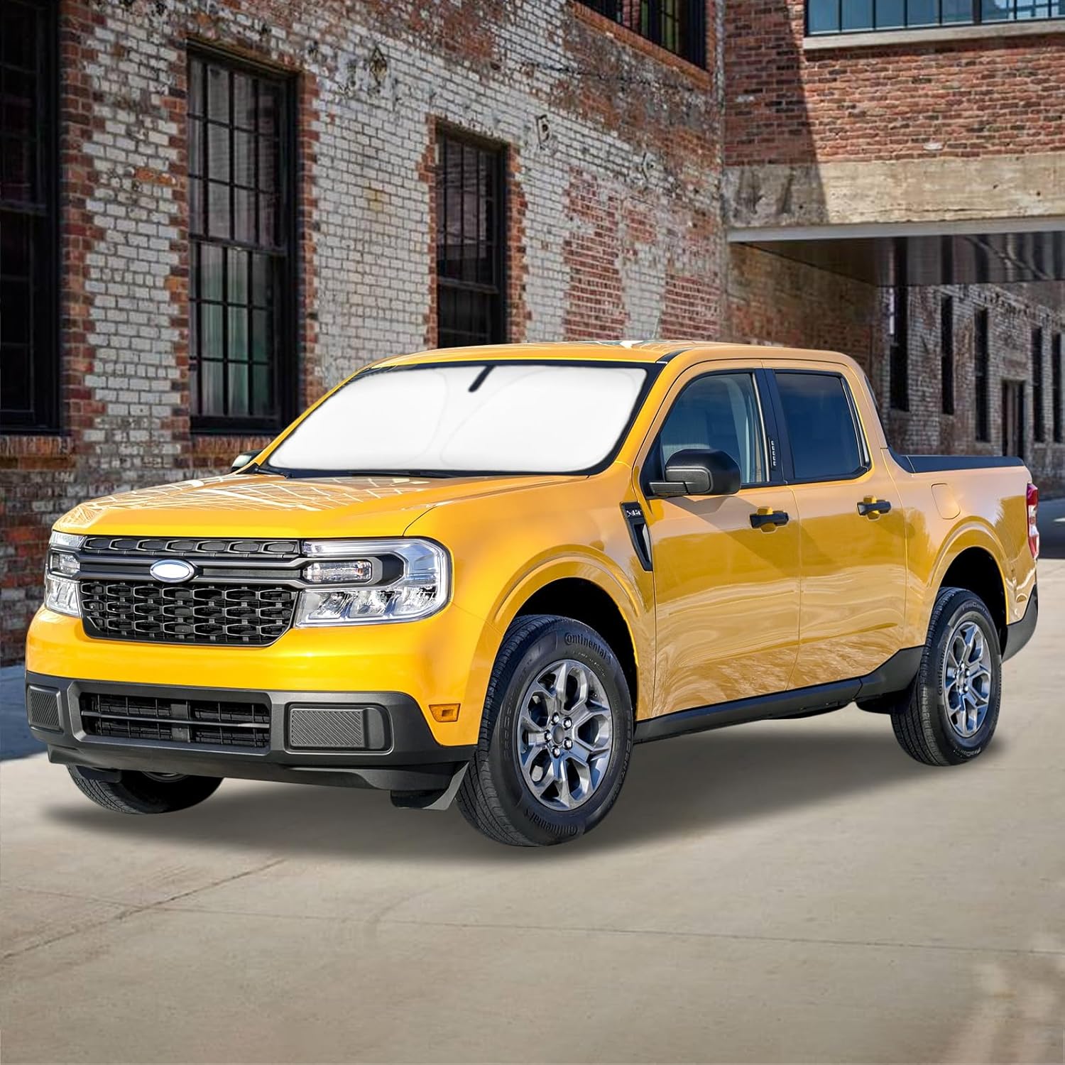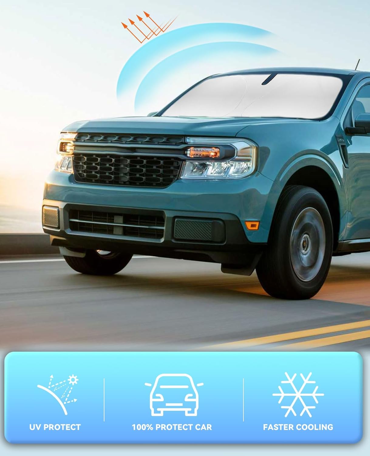 - ăVehicle SpecificăOur Windshield Shade Cover Custom Fit for Ford Maverick Accessories 2022 2023 2024 2025 2026, Full covered your windshield,No Gap,100% Perfect fit. The precise fit design and reinforced steel ring are sufficient to allow the sun shade to precisely fit the front window without the need for suction cups to hold it in place, effectively protecting your car from the sun's rays.