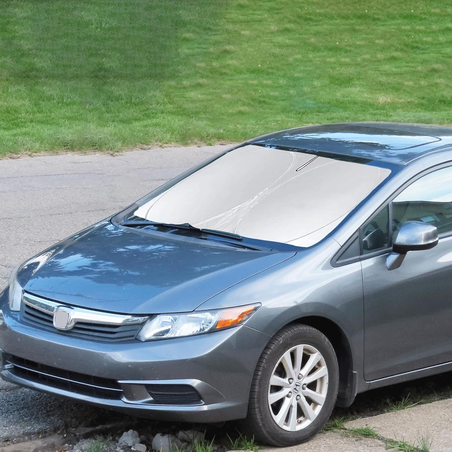 - [UNIQUE DESIGN]-Custom-fit Foldable Sun Shade for 2012 2013 2014 2015 Honda Civic Sedan. Unlike other flimsy sunshade, the INSAUTO sunshade with Velcro fastening, no sunburn on the rearview mirror center and a silver reflective layer on the outside. This means that you get superior insulation that reflects heat. The precise fit design and reinforced steel ring are sufficient to allow the sun shade to precisely fit the front window without the need for suction cups to hold it in place. Once installed it won't have gaps, sags or slumps.
