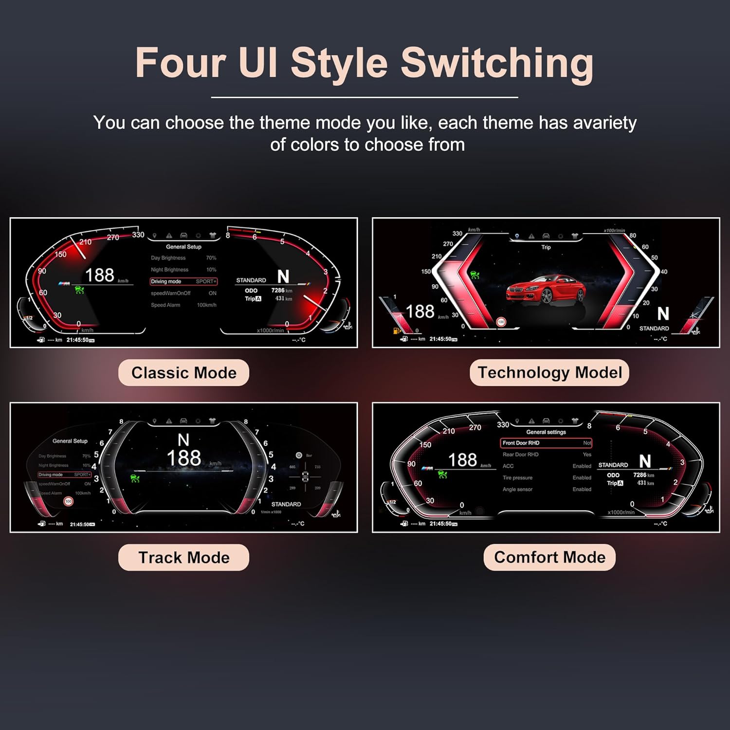 - βοΈ[4 sets of UI styles can be freely switched] This digital cluster odometer features 4 customized modes (simple, comfortable, track, and technology) for the LCD. Additionally, it offers 4 color interfaces (red, purple, blue, and orange) that can be freely changed to enhance your driving comfort. The original vehicle data and information are presented more intuitively