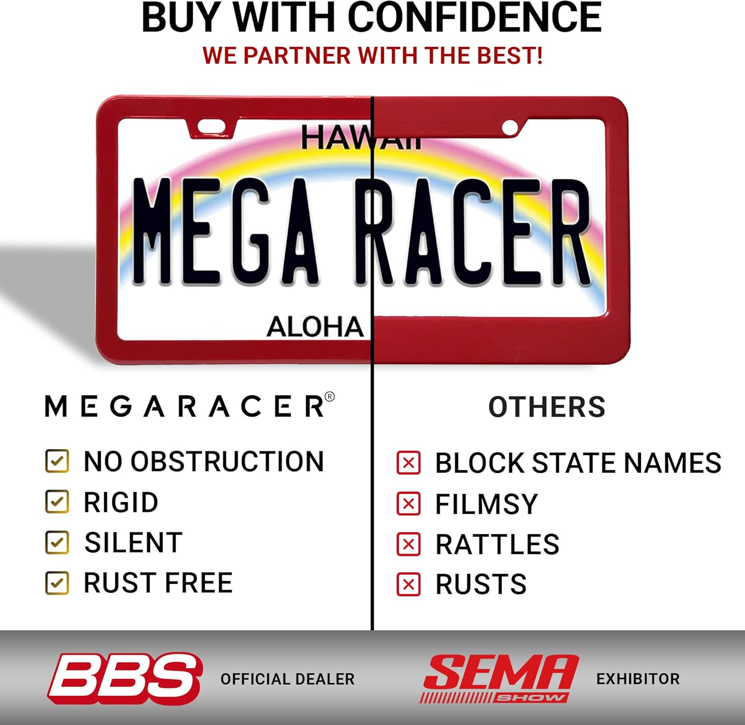 - STRONG DURABLE QUALITY: Our 2 pc License Plate Frame Red Holder is made strong to uphold anything from car washes to weather changes. Mega Racer's red license plate frames are RATTLE PROOF and RUST RESISTANT keeping your vehicle paint SCRATCH FREE.