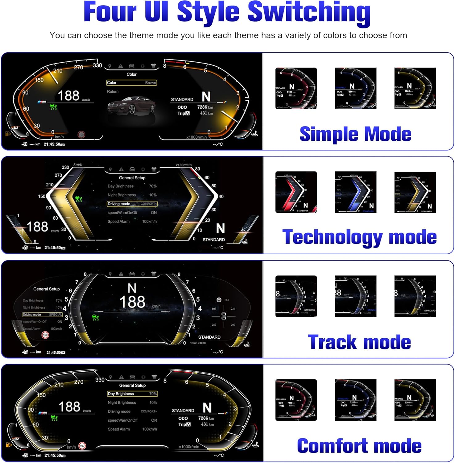 - โ๏ธ[4 sets of UI styles can be freely switched] This digital cluster features 4 customized modes (simple, comfortable, track, and technology) for the LCD. Additionally, it offers 4 color interfaces (red, purple, blue, and orange) that can be freely changed to enhance your driving comfort. The original vehicle data and information are presented more intuitively