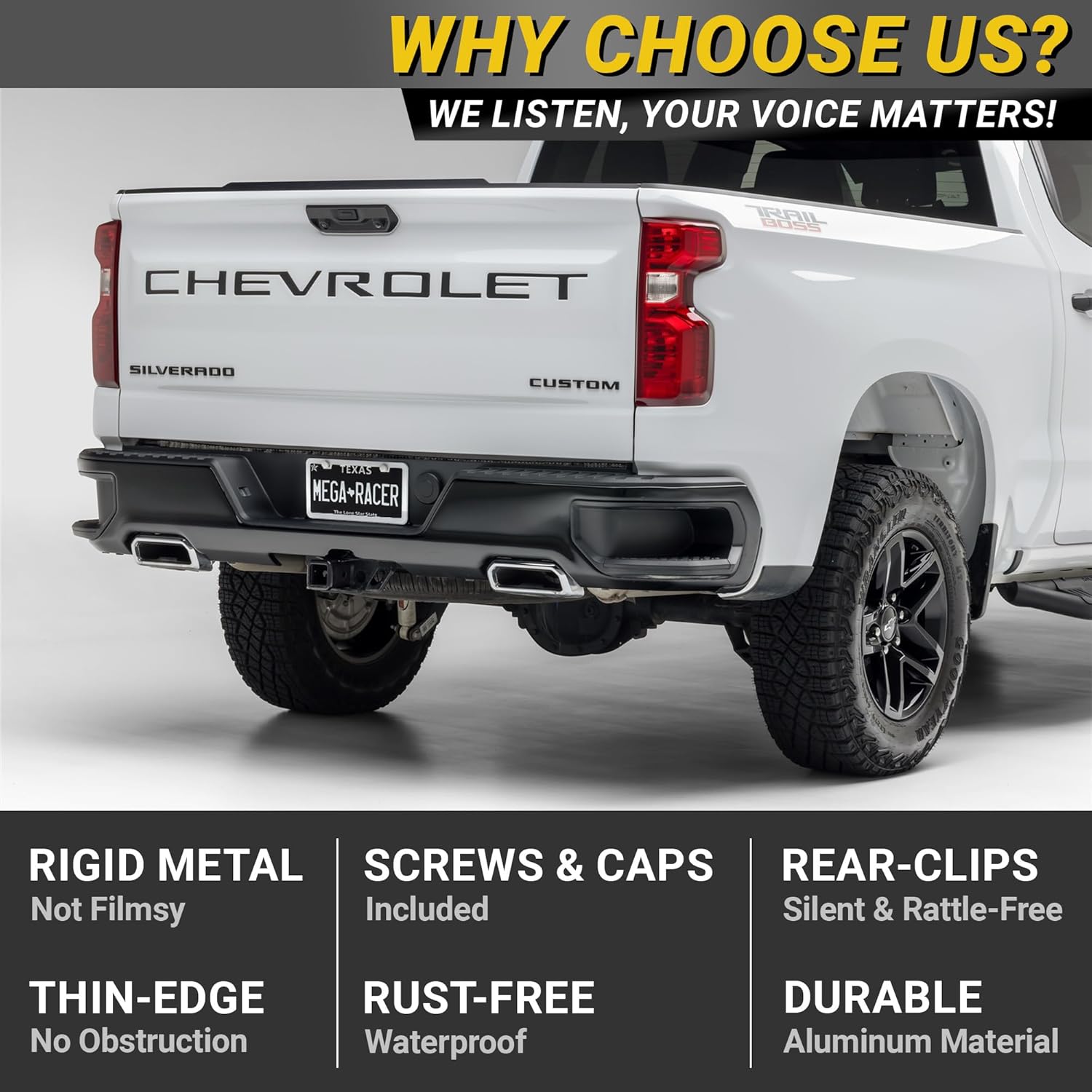 - CUSTOMER SERVICE: Mega Racer's 1 pc White License Plate Frame automotive accessories will leave both you and your ride satisfied. If you have any questions please send us a message via Amazon Message and we will be sure to respond within 24 hours.