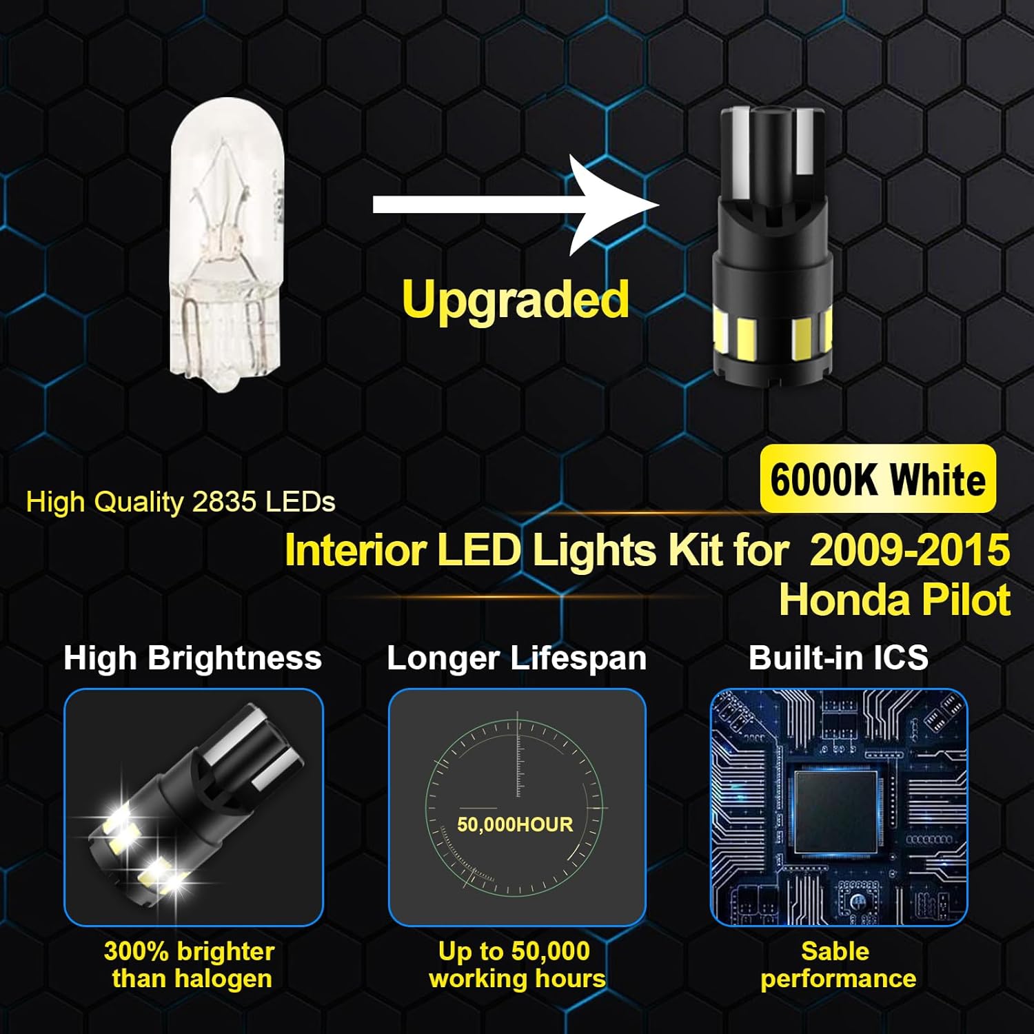 - Custom Fit for Honda Pilot 2009-2015: This 17-piece LED interior light kit is specifically designed for Honda Pilot 2009-2015, providing a perfect fit for your Honda Pilot. Upgrade your Pilot’s cabin with bright, energy-efficient lights that enhance the interior and offer a premium look. Easy installation with no modifications required. A great solution for improving visibility and creating a stylish ambiance inside your Honda Pilot.