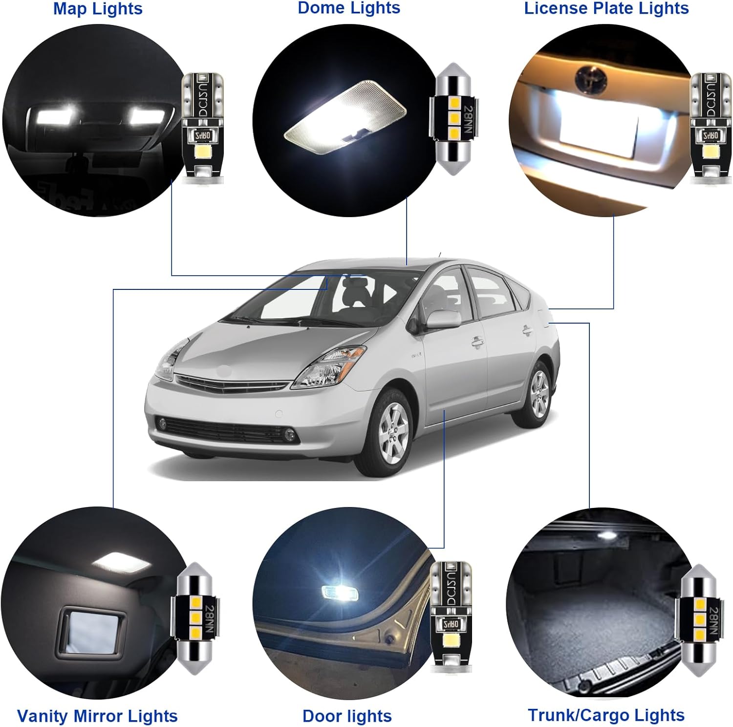 - Complete Upgrade with Installation Tool: The Complete LED Interior Car Lights Package for your Toyota Prius includes a total of 11 LED light kits, covering all your interior lighting needs. This comprehensive upgrade enhances your Toyota Prius's lighting system with map lights, dome lights, vanity mirror lights, glove box lights, footwell lights, and license plate lights. The package also includes 1 install tool and 1 placement diagram for easy installation.