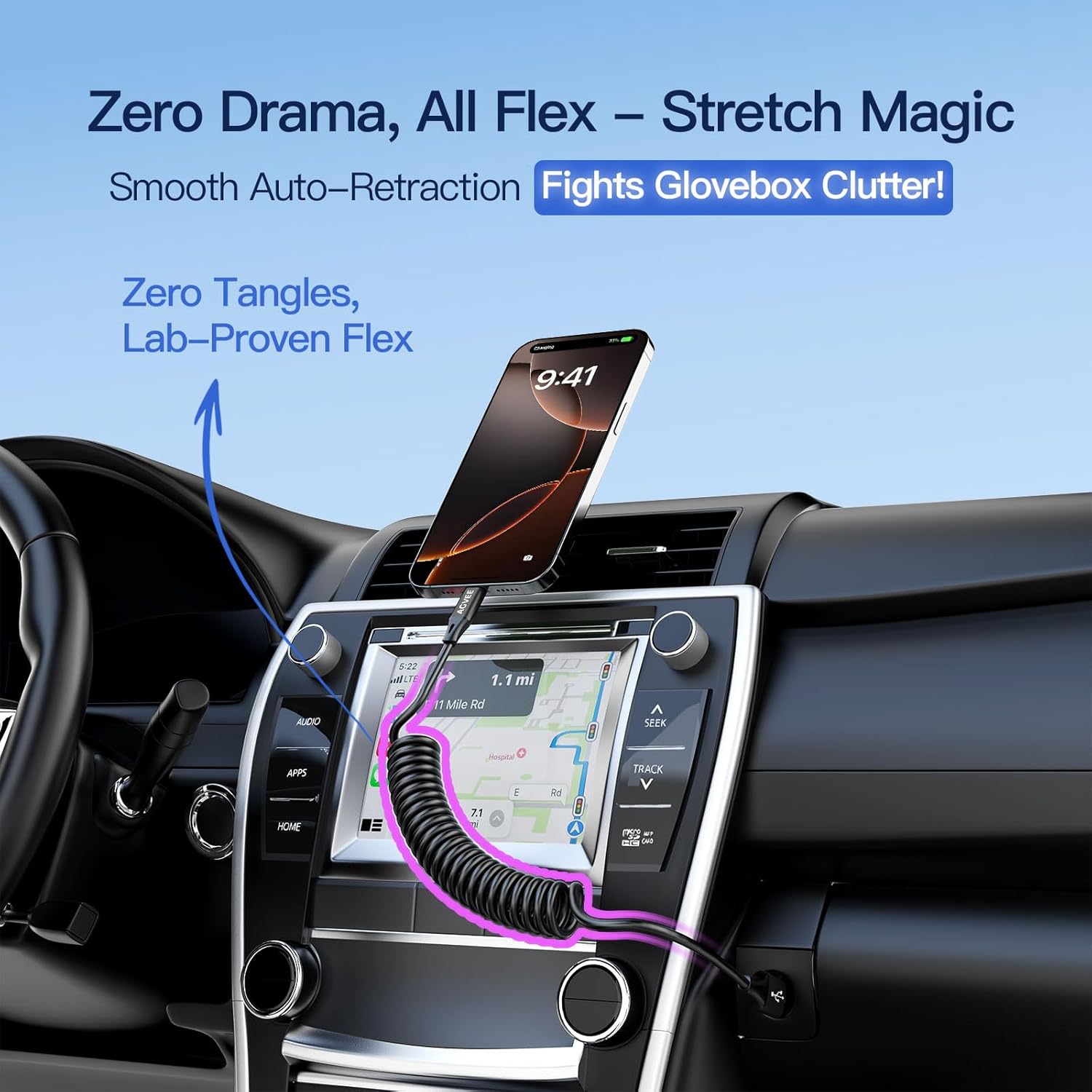 - ๐[Tame Your Car's Cable Jungle] No more wrestling with spaghetti cords! Our coiled design stretches from short to long, perfect for tight car spaces, then snaps back neatly like a slinky. Keep your cup holders free for coffee, not tangled chaos! Soft and elastic: No more wrestling with stiff, frozen-spaghetti-like cables in winter; Squishy as a pacifier, coils like a zen master.