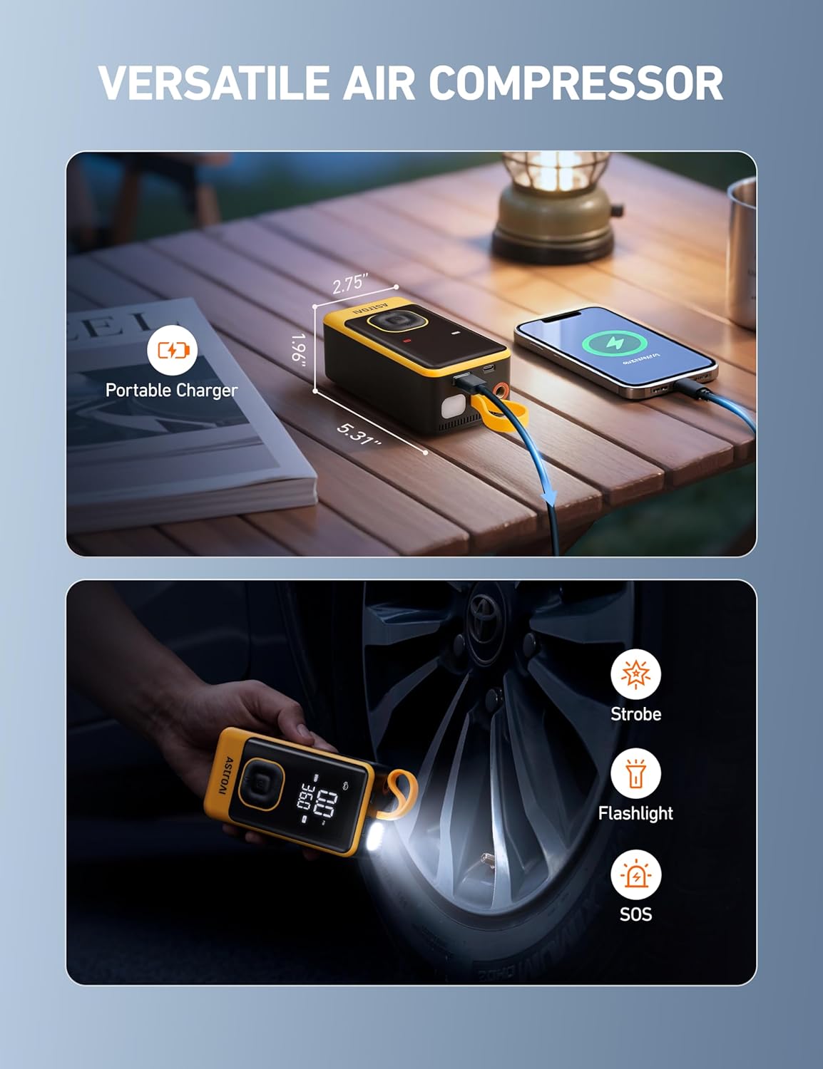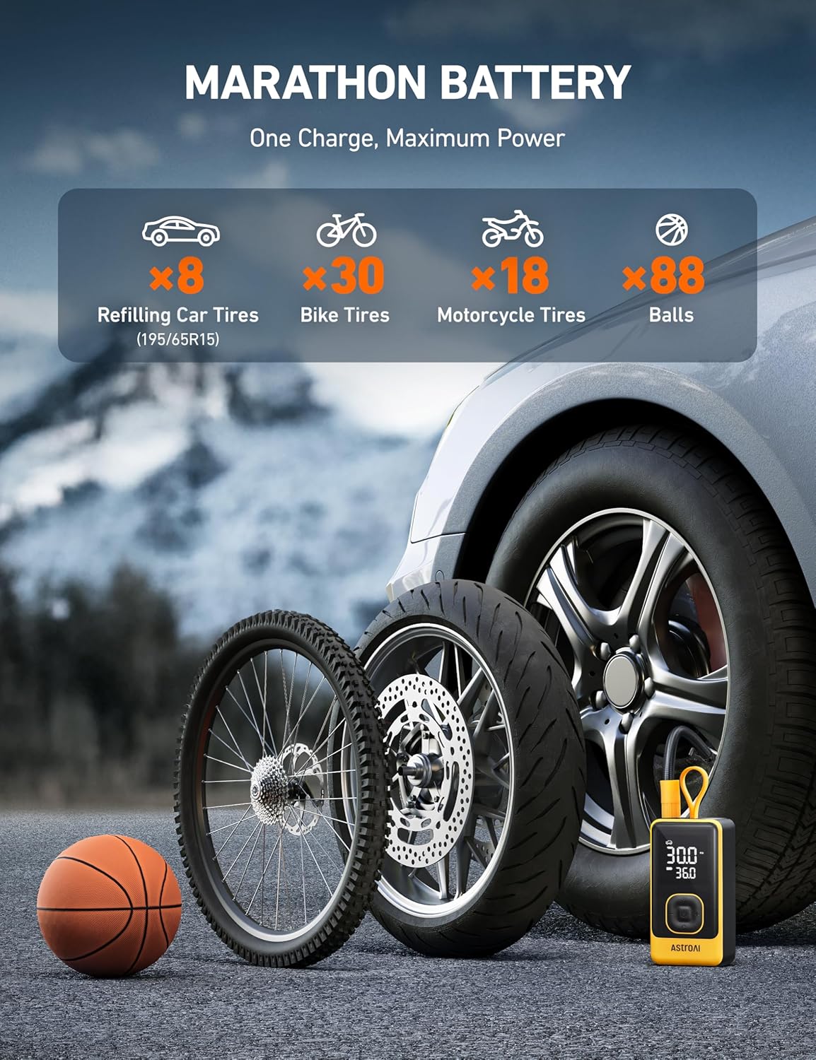 - LONG ENDURANCE, MORE INFLATION: Once fully charged, it can refill 8 car tires, or inflate 30 bike tires, 88 balls, or 18 motorcycle tires. Its intelligent battery management system monitors the power in real-time, making it perfect for long trips, outdoor activities, and daily commuting
