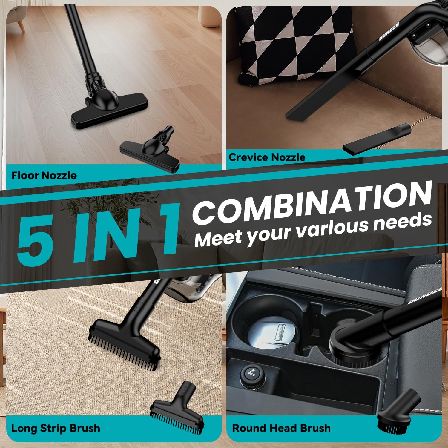 - Your reliable cleaning ally: The vacuum cleaner features a 5-in-1 design and comes with four different nozzles and brushes, this vacuum cleaner can meet all your cleaning needs, whether it's carpets, hard floors, furniture or tight corners.