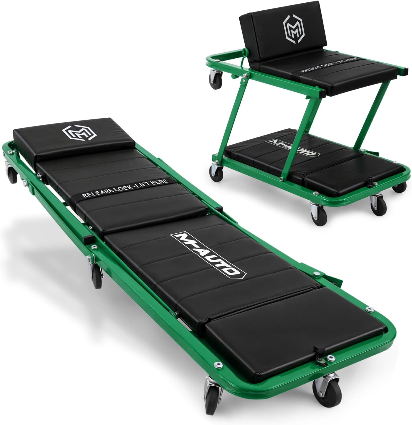 M-AUTO Heavy-Duty Convertible Mechanic Creeper, Z-Creeper 2-in-1 Creeper and Seat 48" Padded Adjustable Headrest Roller Garage Chair with 7 Swivel Casters for Washing, Detailing, Maintenance, Green